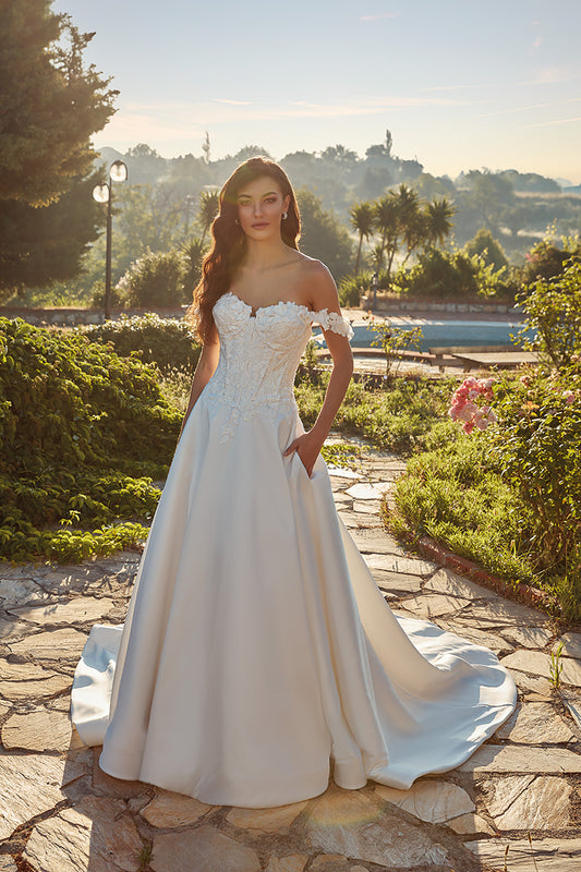 Find your perfect off the shoulder wedding dress today! Call us at 513-821-6622 or book your appointment here to schedule your fitting!