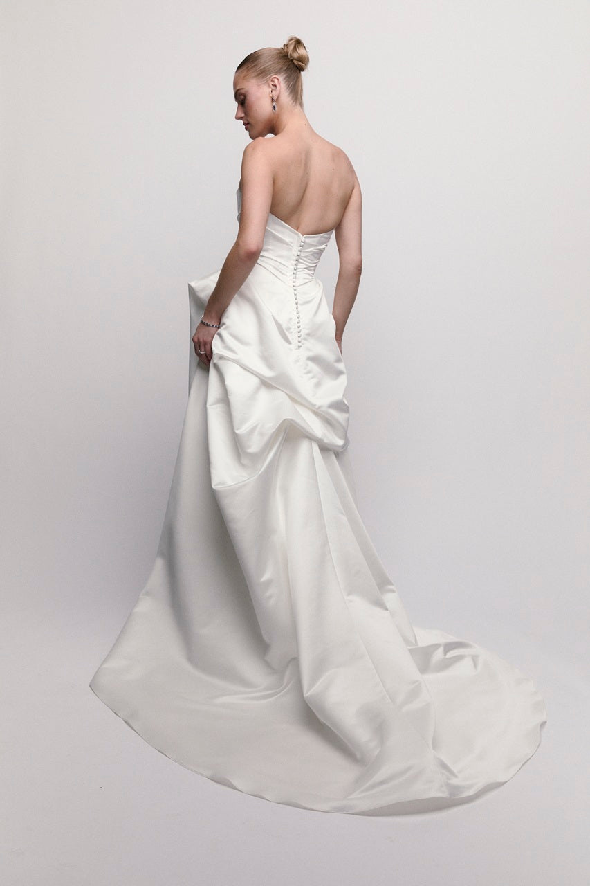 Alfons is a study in sculptural softness. The draped bodice wraps into a soft sweetheart neckline and drop Basque waist, beautifully defining the figure. Crafted in lustrous Jewel Satin, the skirt features custom-placed tucks designed to create organic texture and fluid movement. The result is a silhouette that feels architectural yet effortlessly romantic.