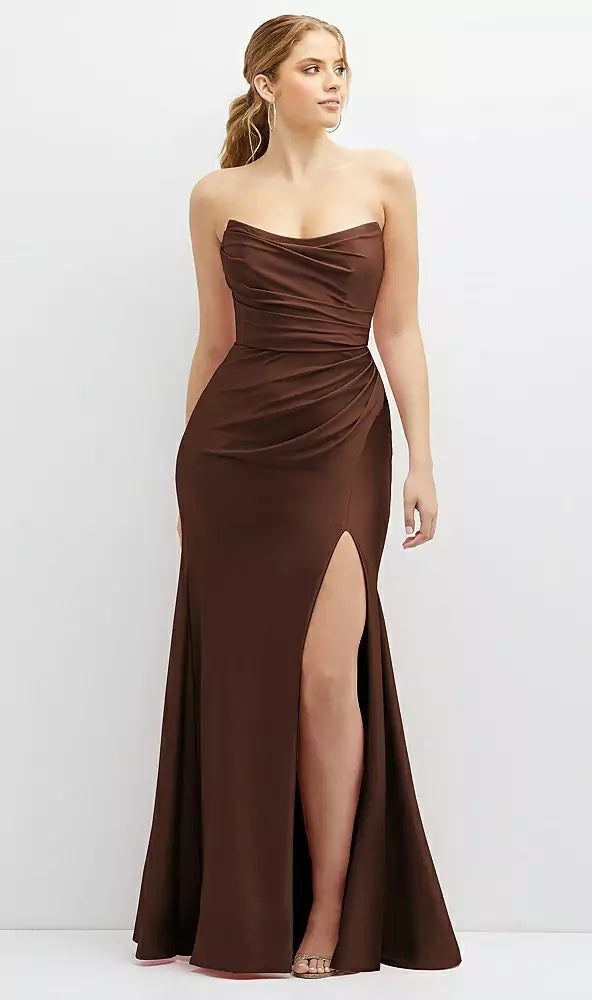 Glamorous and figure-flattering, the Amaya bridesmaid dress is designed in luxe stretch satin with a sculpted, strapless silhouette. The elegant basque (cat-eye) neckline adds a refined edge, while delicate draping and subtle gathers enhance the waistline and curves. A dramatic mermaid skirt with a side slit and horsehair hem adds structure and flair, creating a stunning finish for a showstopping aisle or dance floor moment.
