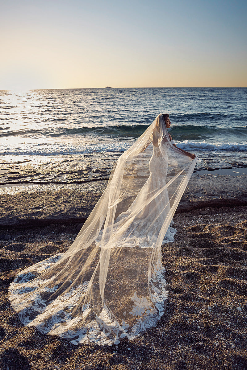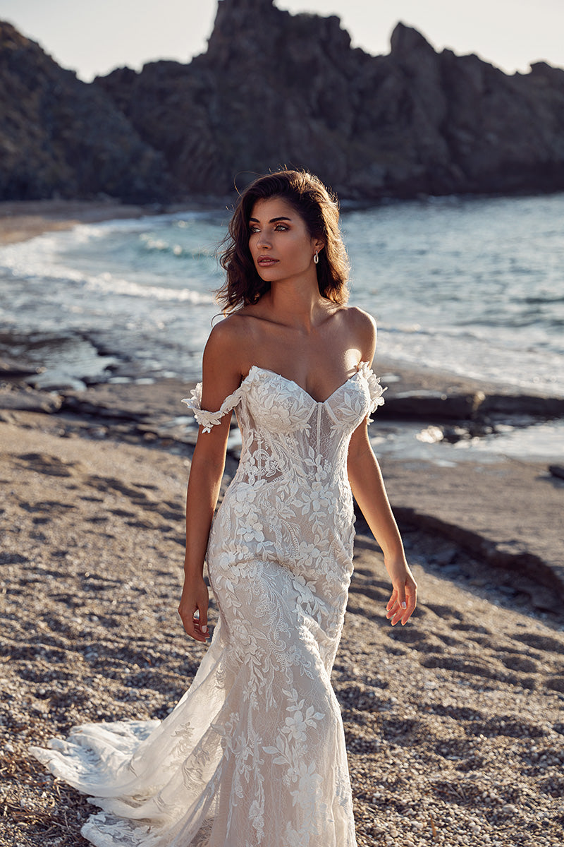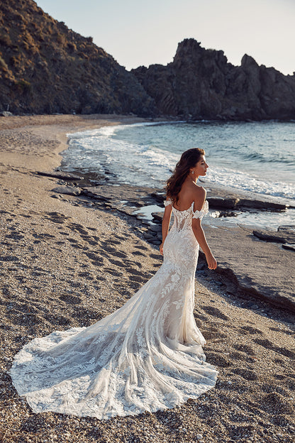Daring, enchanting, and utterly romantic—Amora is a trend-forward fit-n-flare gown designed for the bride who dreams in lace. Delicate ivory lace and sequins shimmer over soft tulle, with a champagne-skin illusion bodice for a touch of allure. The off-the-shoulder 3D lace straps add sculptural elegance, while the fitted silhouette flares out into a dramatic skirt. Finished with covered buttons down to the end of the train, this gown is made to captivate from every angle.