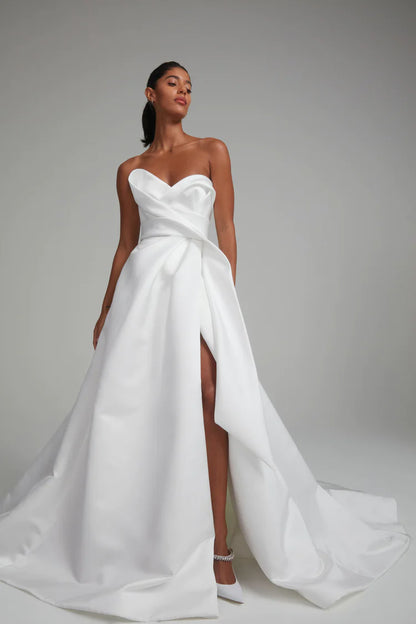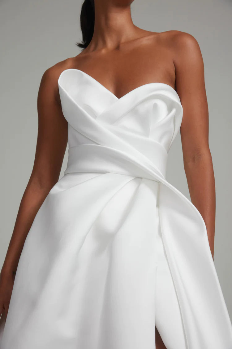 Experience luxury with this Italian double-face duchess satin gown, featuring a stunning wrap skirt that elegantly flows to the floor. The architectural bias band bodice showcases a beautifully draped design, creating a refined silhouette that enhances your figure. This gown effortlessly combines sophistication and modernity, making it an ideal choice for the discerning bride who desires a striking yet timeless look on her special day.