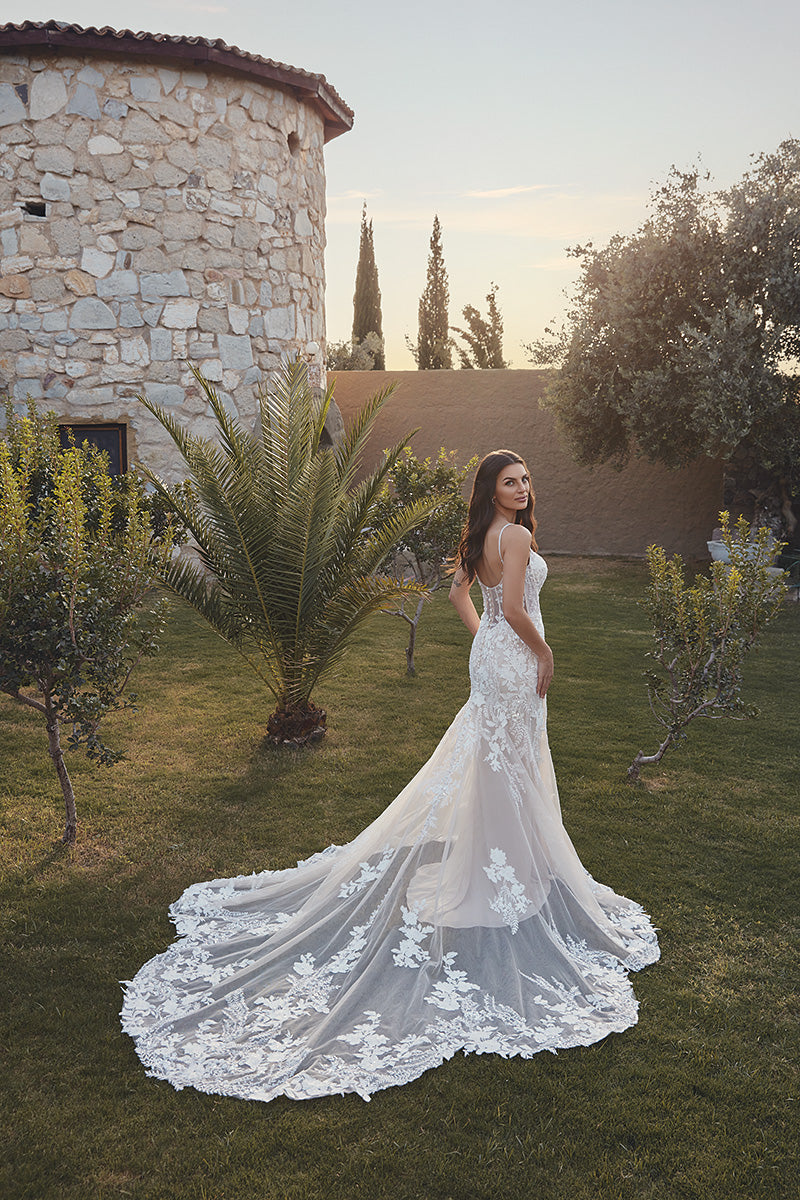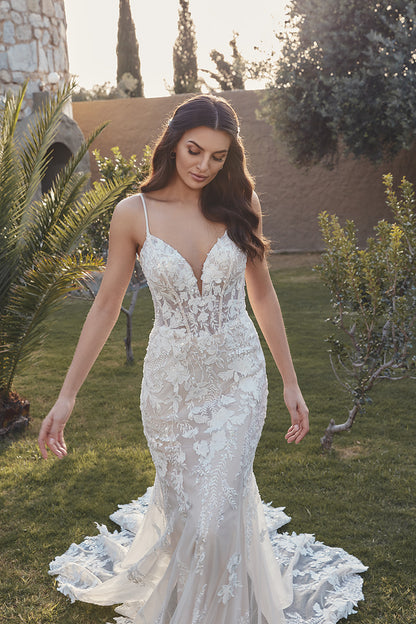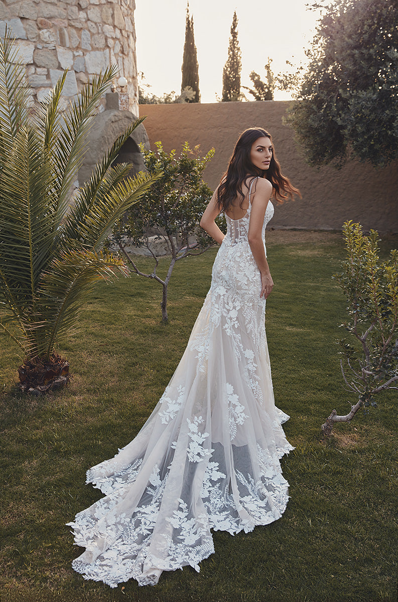 Timeless, minimal, and undeniably romantic—Angie is the definition of elegance with a modern twist. This fit-n-flare gown features intricate beaded ivory lace and shimmering sequins layered over soft tulle. The champagne-skin illusion bodice is unlined for a refined, sculptural look, while delicate beaded spaghetti straps add a whisper of sparkle. With buttons trailing to the end of the train, Angie is a sophisticated stunner from every angle.