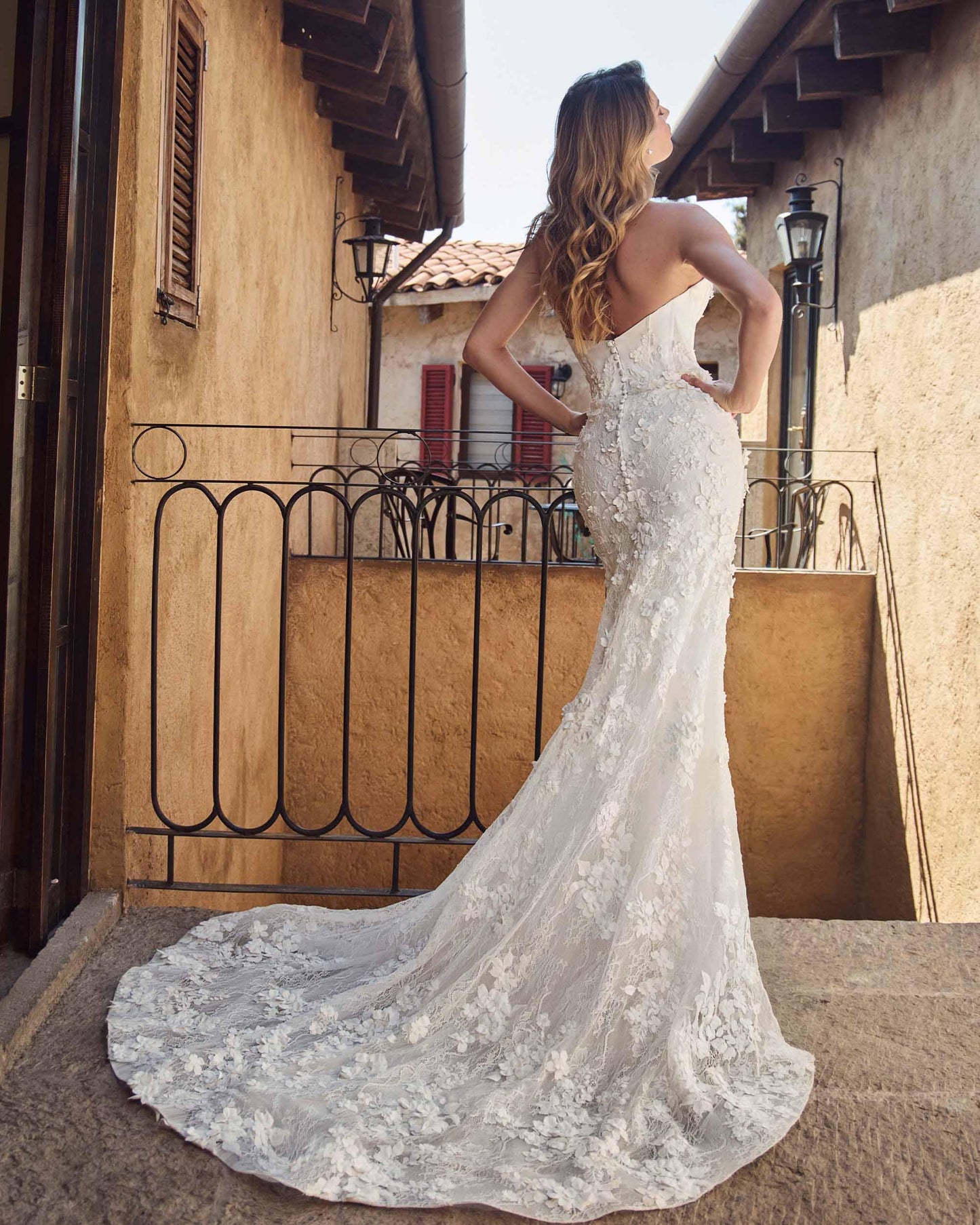 Confident and couture, the Arietta gown is a strapless sheath silhouette with a sculpted basque waistline that flatters every curve. Layered 3D lace and soft satin create dimensional texture, while the semi-sweetheart neckline adds a touch of drama. Finished with a sweeping train, Arietta is perfect for destination vows or a glamorous celebration.