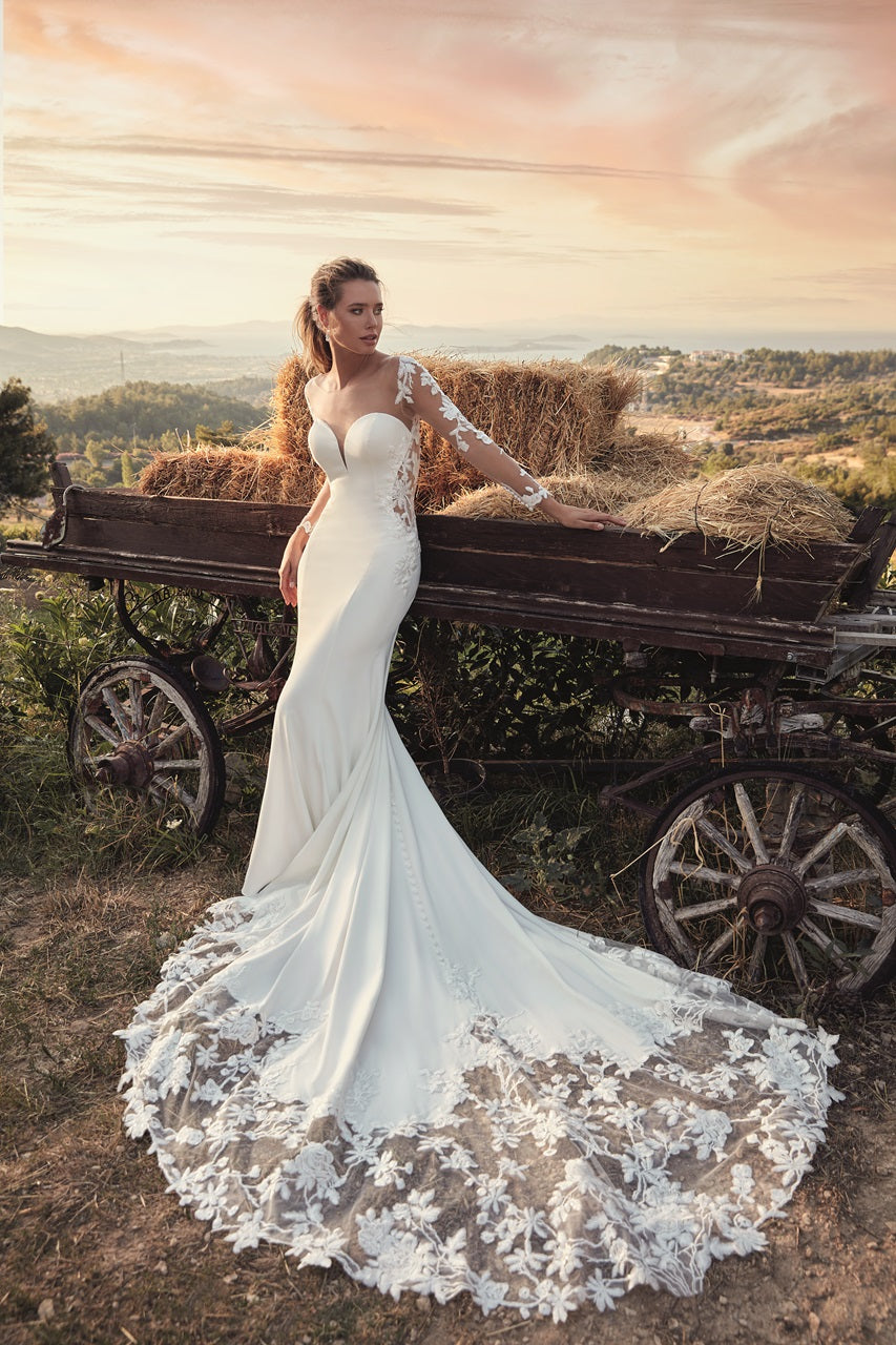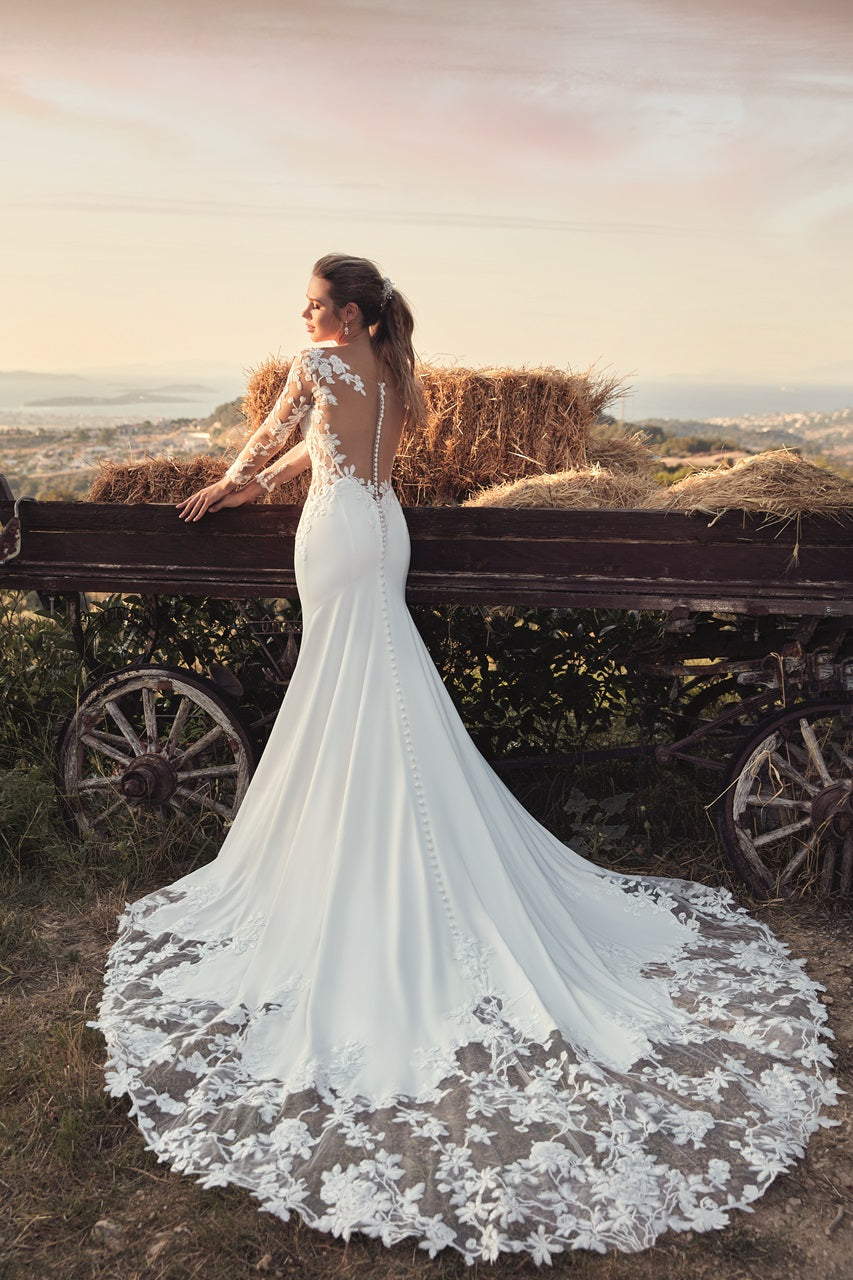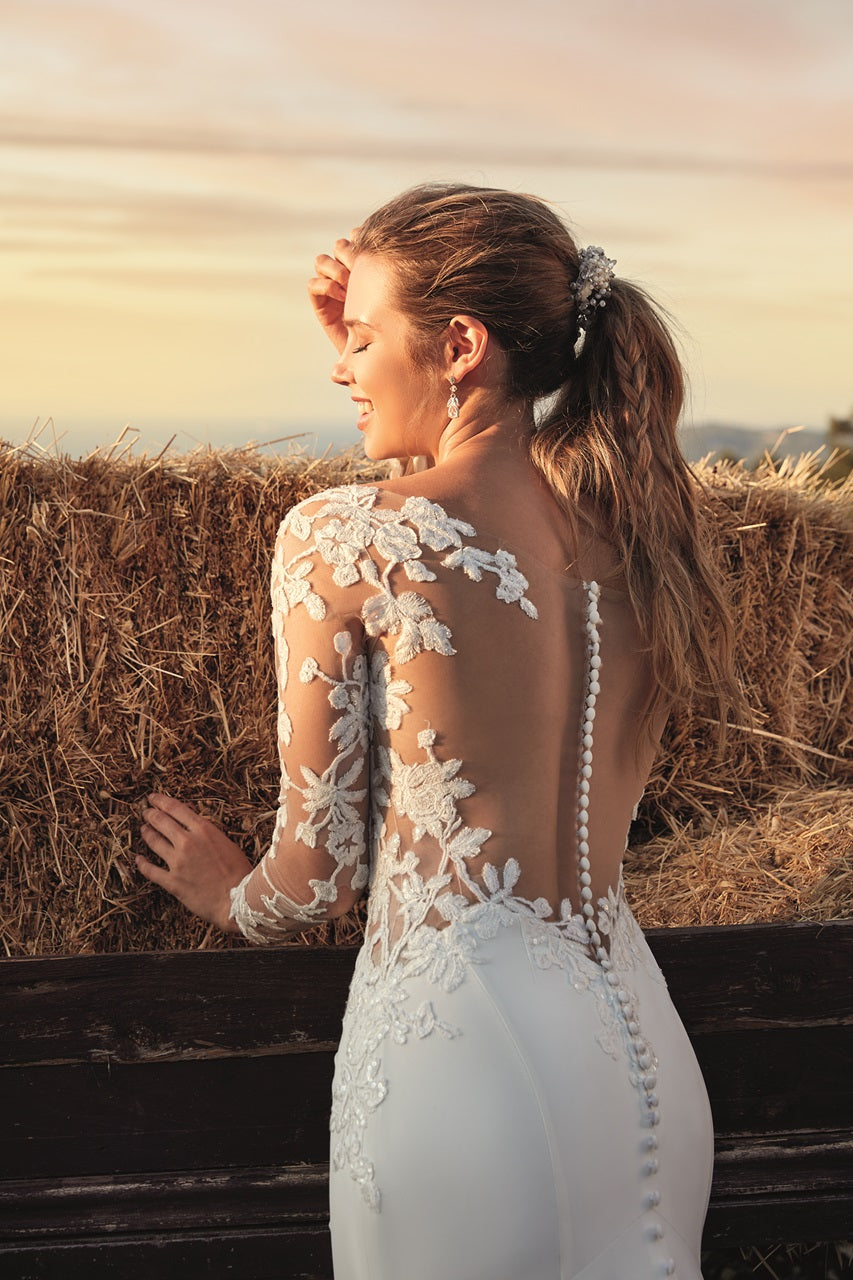 This breathtaking bridal gown is a blend of modern sophistication and timeless romance. The gown features a sleek crepe base paired with lace appliqués adorned with shimmering sequins, creating a stunning interplay of textures. The skin illusion neckline and transparent back add a touch of allure, perfectly complemented by delicate long sleeves with lace detailing. A stretchy ivory lining ensures comfort while maintaining a flawless fit. Buttons run gracefully along the train, adding a classic finishing touch to this exquisite design. Perfect for brides seeking elegance with a hint of drama!