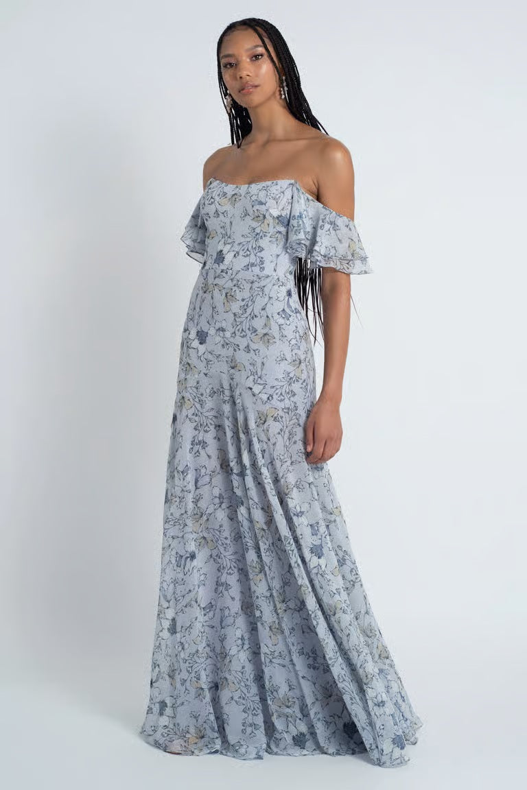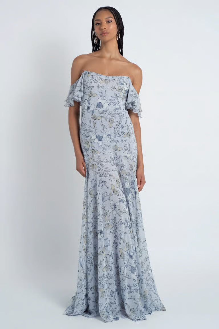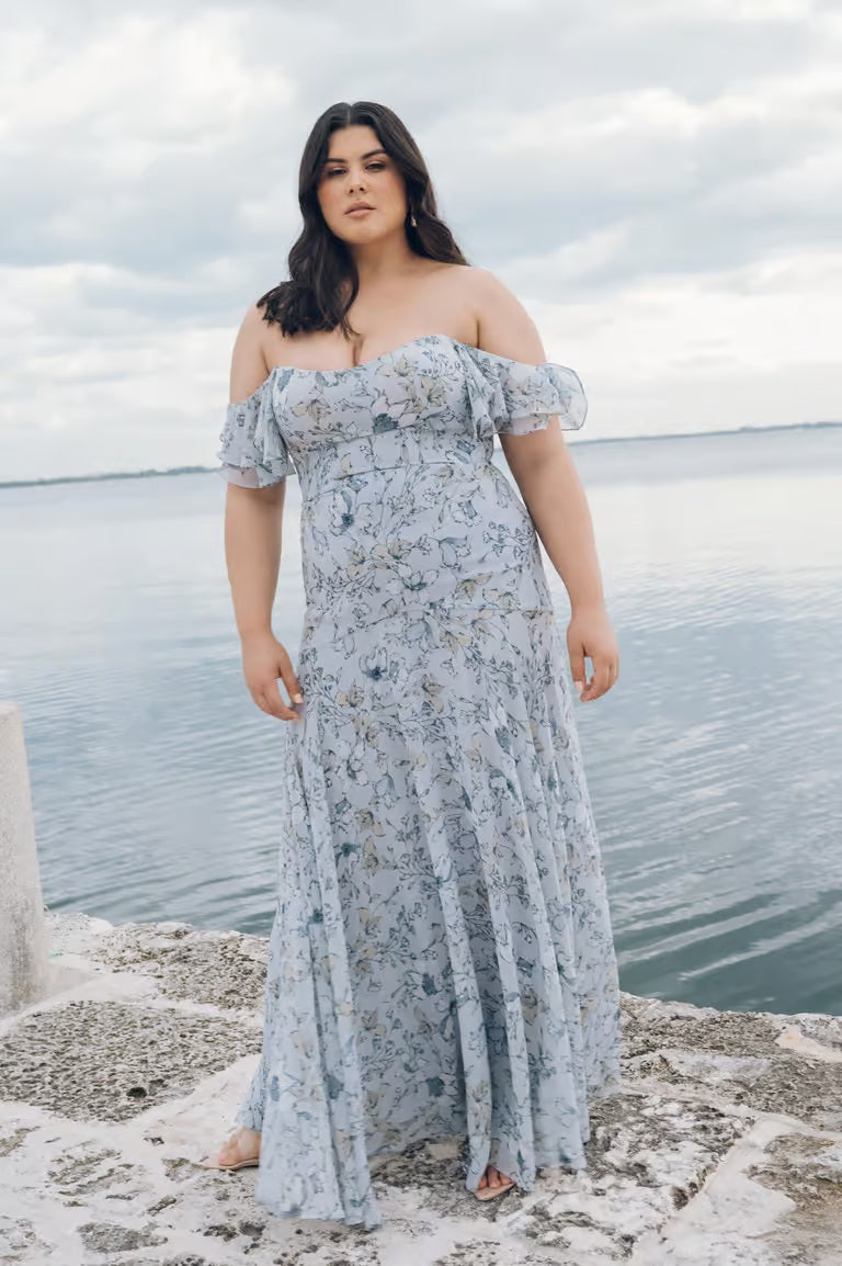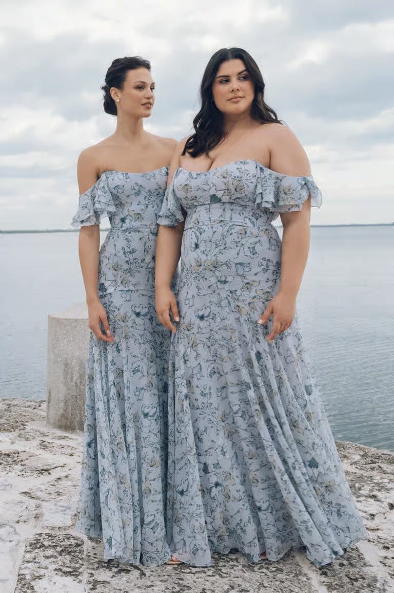 Romantic and airy, the Belen bridesmaid dress brings soft movement and feminine charm to your bridal party. Crafted in Sahara floral printed chiffon, this gown features a graceful scoop neckline and layered off-the-shoulder ruffle sleeves for a whimsical touch. The fitted skirt yoke highlights your shape, while the full flounce hem offers effortless flow with every step. A dreamy choice for floral-forward weddings.