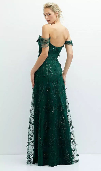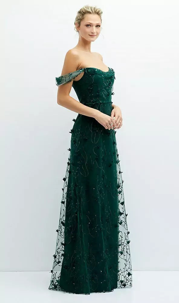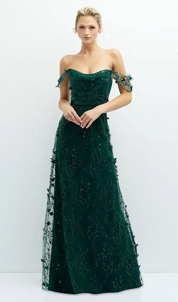Whimsical and romantic, the Birch bridesmaid dress enchants in Trellis 3D floral sequin embroidery. The off-the-shoulder neckline features a soft cowl drape that adds graceful movement and elegance. Delicate 3D florals trail along sparkling vine-like embroidery, creating an ethereal effect. A softly flowing A-line skirt hugs the natural waist for a flattering, fairy-tale silhouette—perfect for garden weddings or any dreamy celebration.
