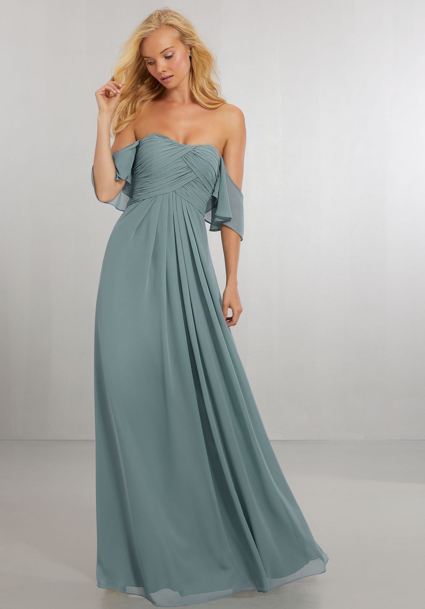 This chiffon bridesmaid gown features a softly draped A-line silhouette and a flattering scooped neckline. Flounced off-the-shoulder straps add a playful, romantic touch, while the scoop back with zipper closure completes the look.