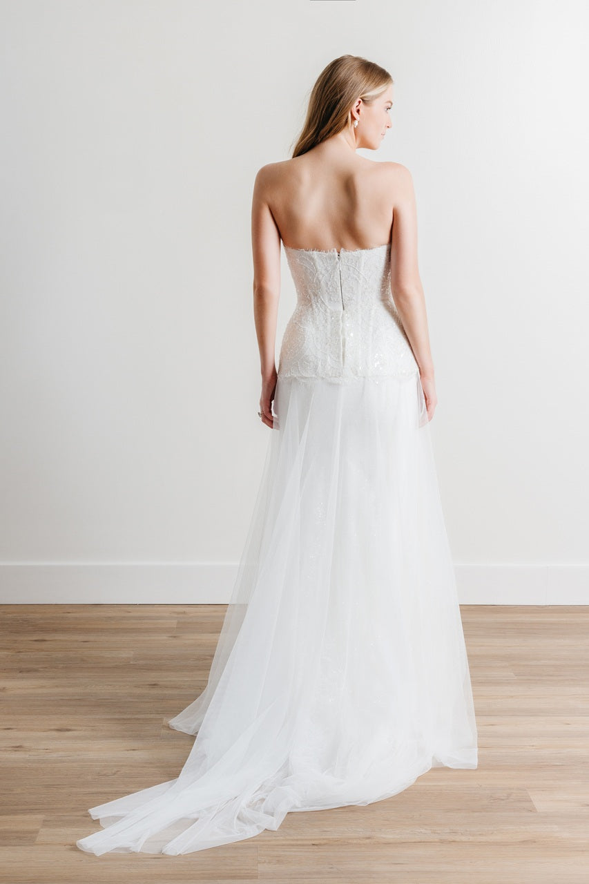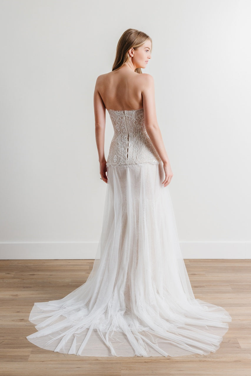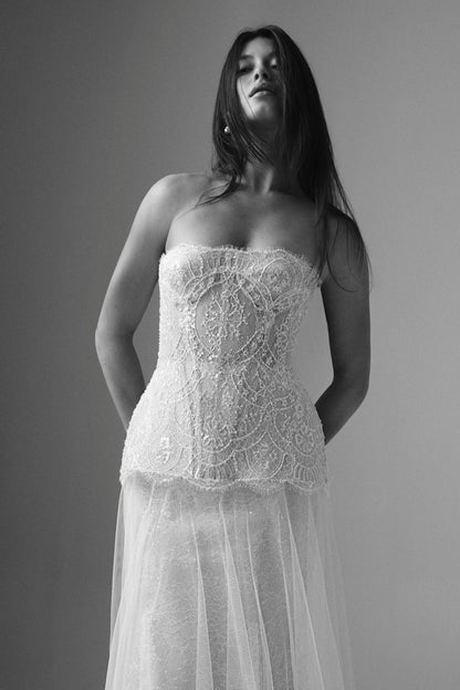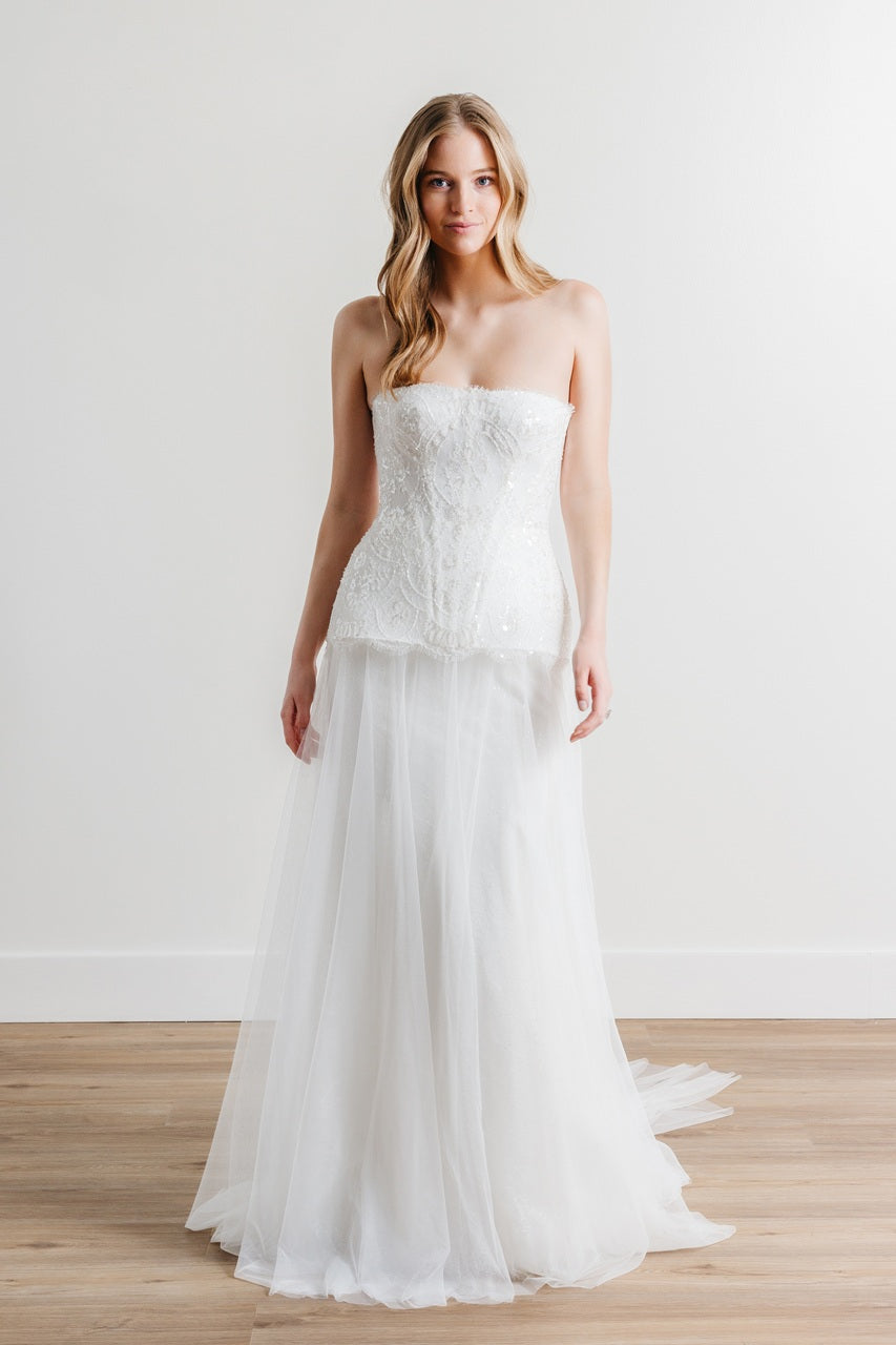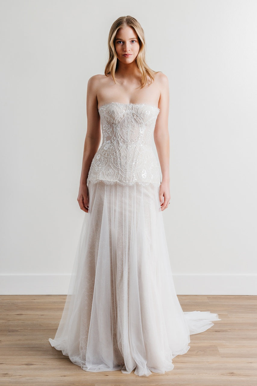 A breathtaking blend of timeless elegance and intricate detail, the Brookhaven gown by Watters is designed for brides who love romantic sophistication. The strapless bodice is beautifully adorned with ornate beading and embroidery, creating a couture feel from every angle. With its drop waist silhouette and chapel-length train, this gown sculpts the body and softly flows into a dreamy tulle skirt—perfect for a walk down the aisle that feels unforgettable.