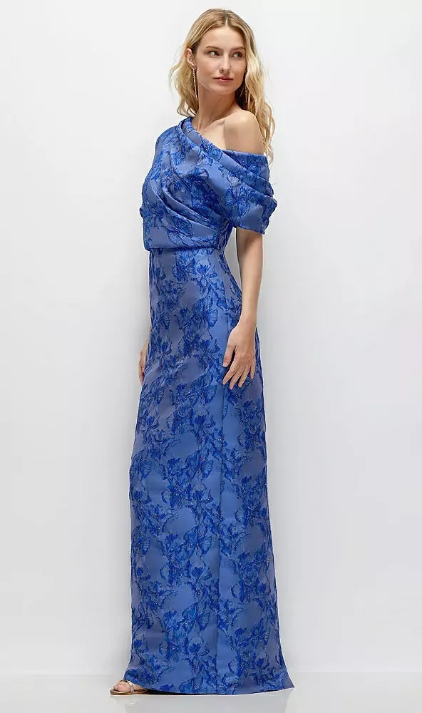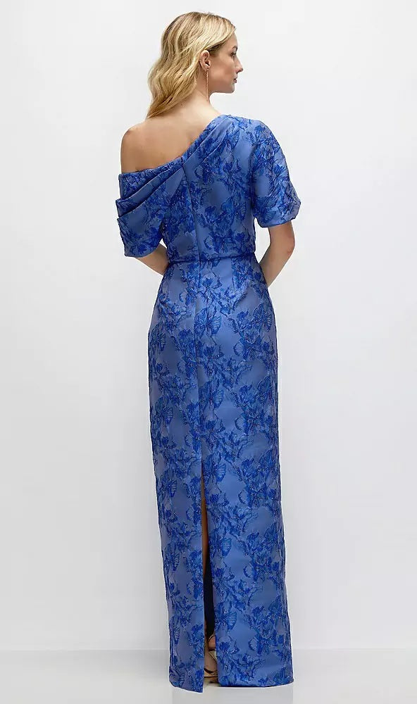 Make a bold statement in the Camille Bridesmaid Dress. Crafted from luxe cobalt floral metallic jacquard, this showstopping maxi dress features an asymmetrical off-the-shoulder neckline that drapes effortlessly for a dramatic silhouette. The structured column shape flatters with clean lines, while a subtle back slit adds comfort and movement. Shimmering metallic threads woven into the bold cobalt floral pattern catch the light beautifully, making this dress the ultimate blend of elegance and edge.