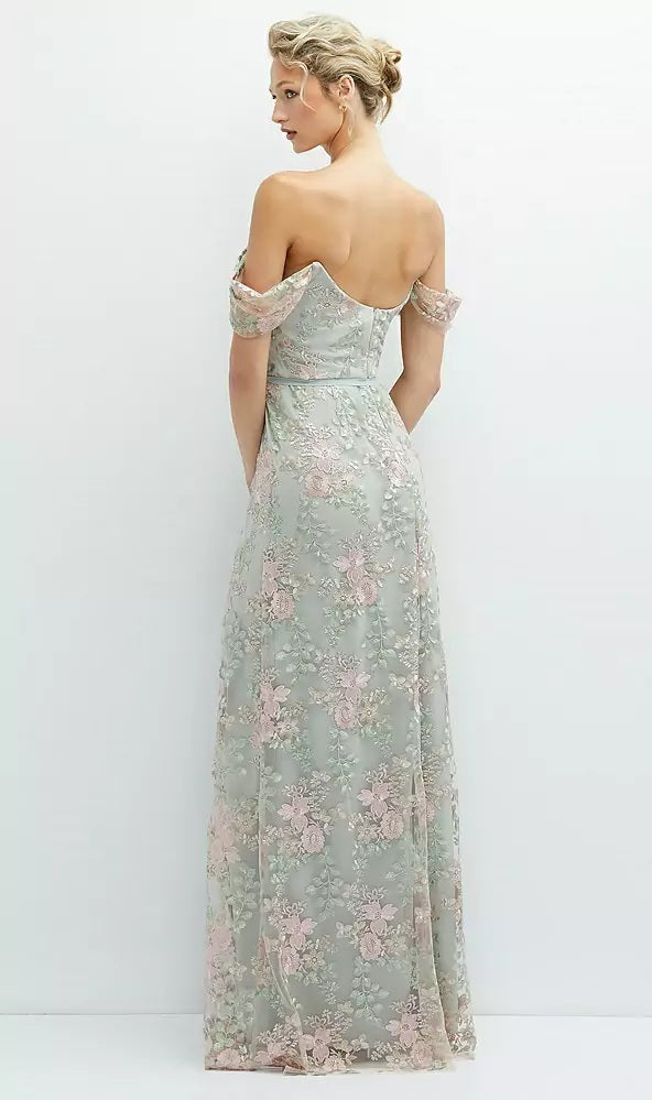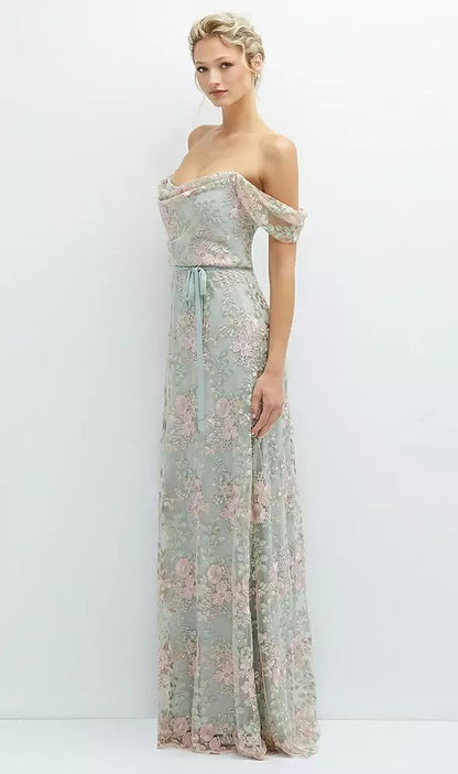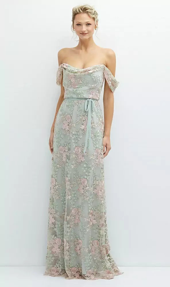 Whimsical and effortlessly romantic, the Chapman bridesmaid dress is a pastel dream brought to life in Ivy Fleur embroidery. The off-the-shoulder neckline features a soft cowl detail for a relaxed yet elegant look. A breezy A-line skirt flows from the natural waist, cinched with a coordinating skinny tie sash that matches the dress lining. The multi-colored floral embroidery adds a fresh, boho-chic vibe—perfect for garden weddings, spring celebrations, and bridal parties who love to stand out.