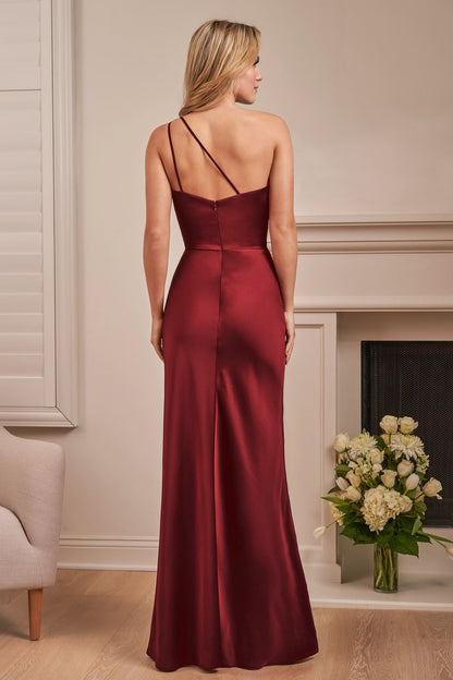 Modern and undeniably striking, this charmeuse bridesmaid dress is designed for the effortlessly confident bridal party. The asymmetrical one-shoulder neckline is elevated with double spaghetti strap detailing, creating a bold, fashion-forward silhouette. A soft A-line skirt skims the hips with princess seams for a flattering fit, while the back features a subtle dip and unique strap accents. A sleek, elevated look from every angle.