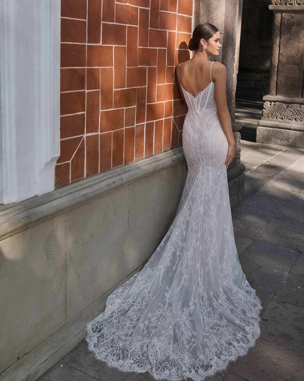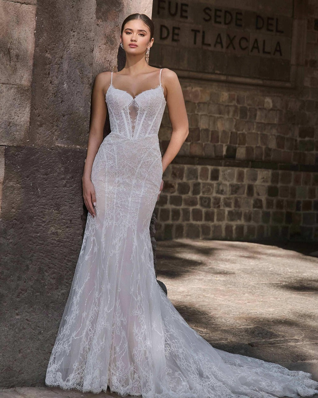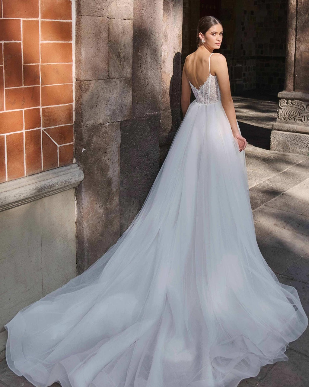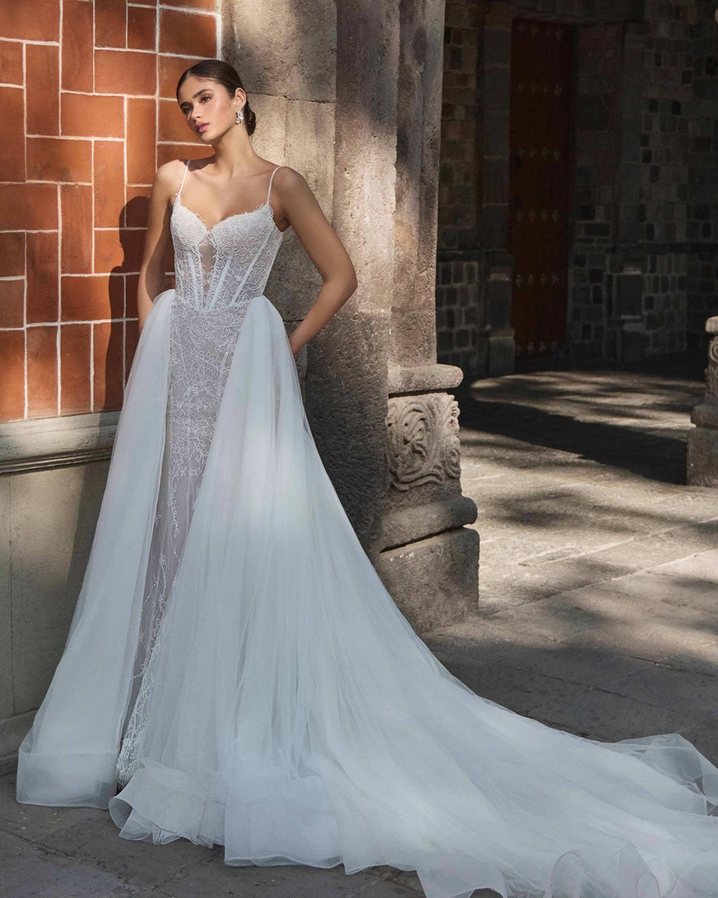 Chiara captures the essence of effortless romance with a daring twist. This sheath silhouette hugs your curves in luxurious lace, highlighted by a dramatic sweetheart plunge neckline and delicate spaghetti straps. A detachable tulle overskirt adds soft volume for the ceremony, then slips away for a sleeker reception look—two unforgettable styles in one unforgettable gown. Perfect for rustic, beachside, or countryside “I dos.”