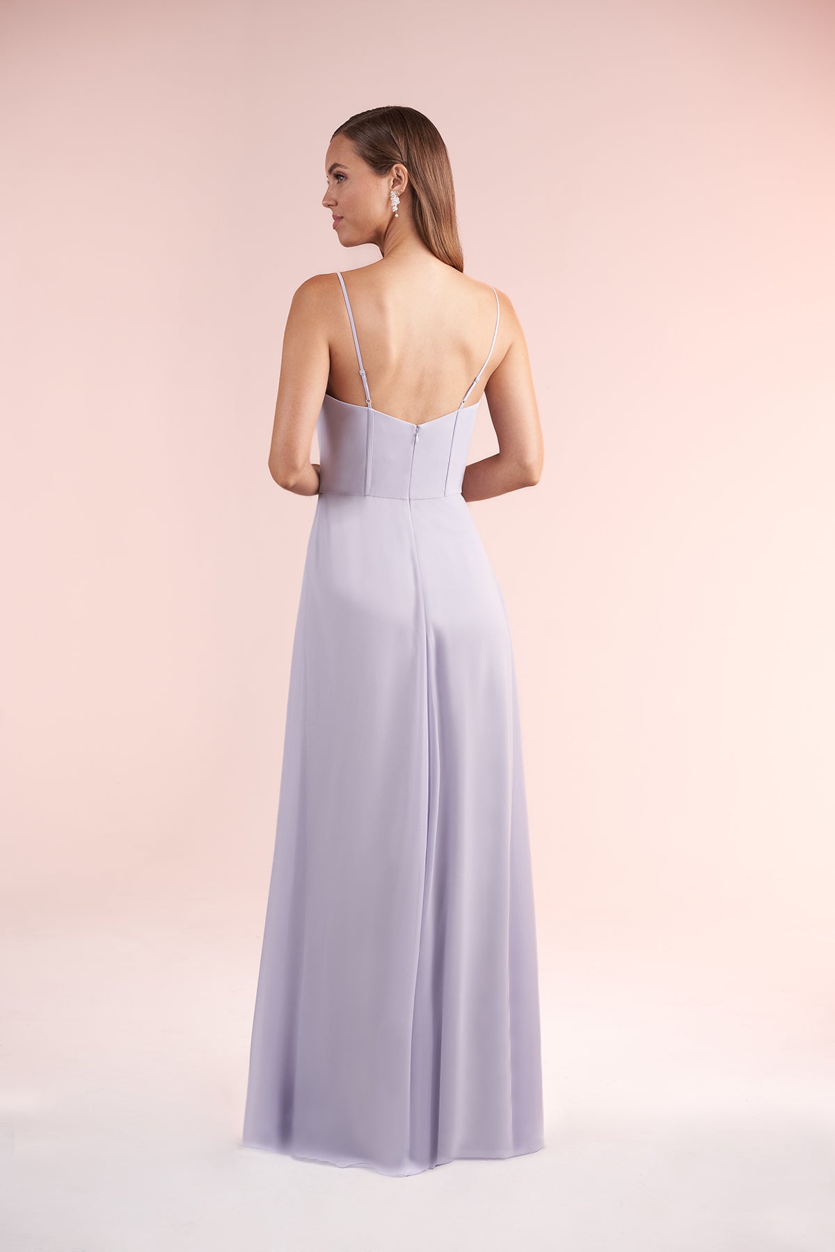 Effortlessly romantic and universally flattering, this poly chiffon bridesmaid dress is a versatile choice for any celebration. The soft cowl neckline is supported by adjustable spaghetti straps for a custom fit, while the corset-inspired bodice adds gentle structure and a touch of vintage charm. A flowing A-line skirt with a front slit and hidden pockets ensures comfort and graceful movement from aisle to dance floor.