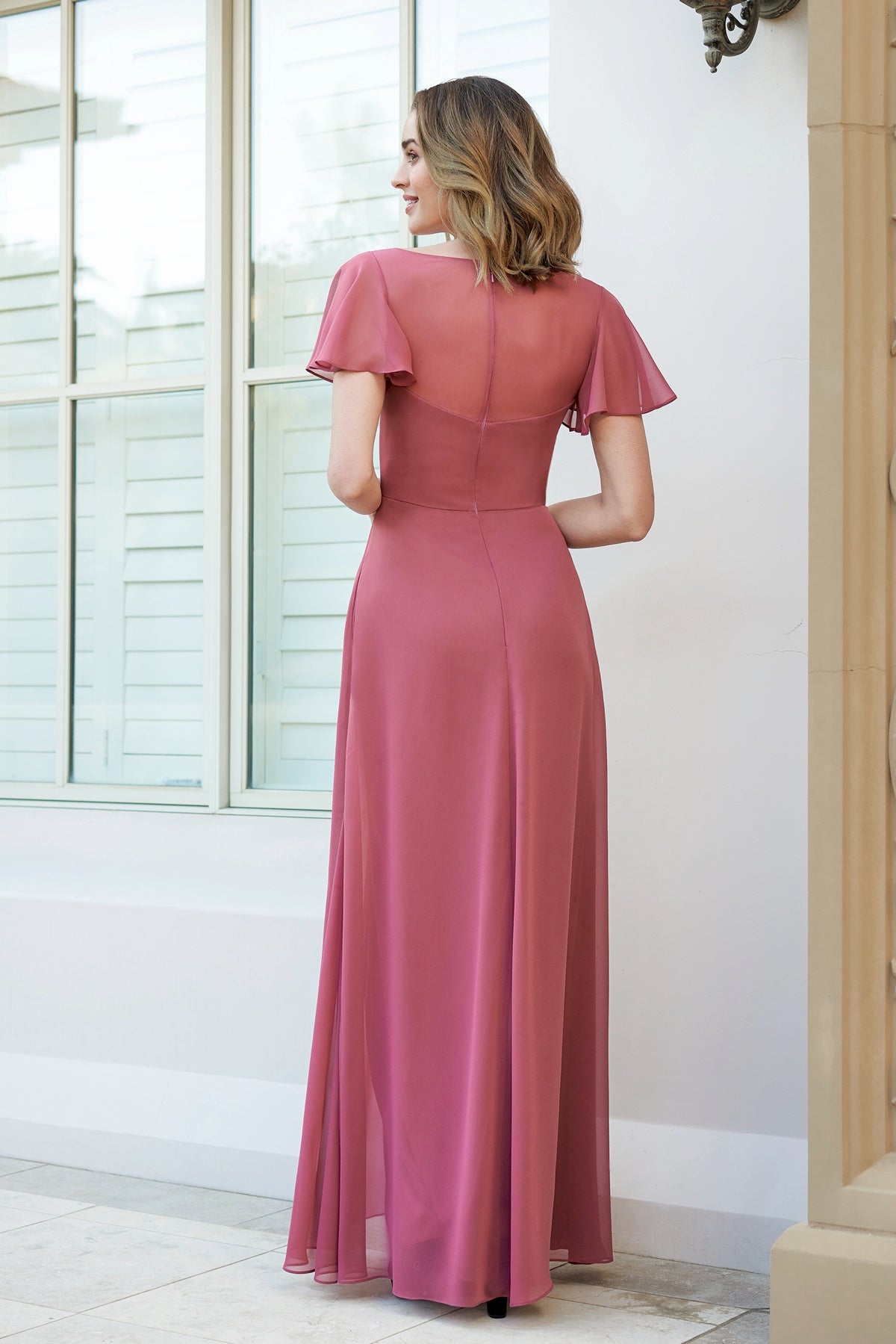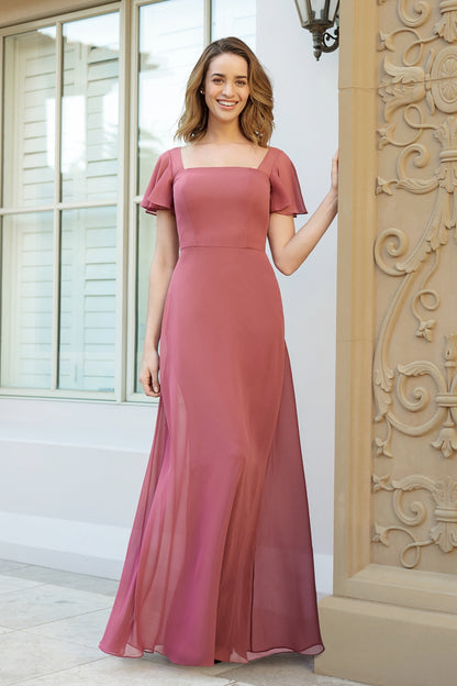 Clean, modern lines meet soft romantic details in this poly chiffon bridesmaid dress. The square neckline adds a fresh, contemporary touch, while fluttery butterfly sleeves offer an airy, feminine feel. With an effortlessly flattering A-line silhouette and hidden pockets, this gown blends simplicity with practicality—ideal for a graceful and polished bridal party look.