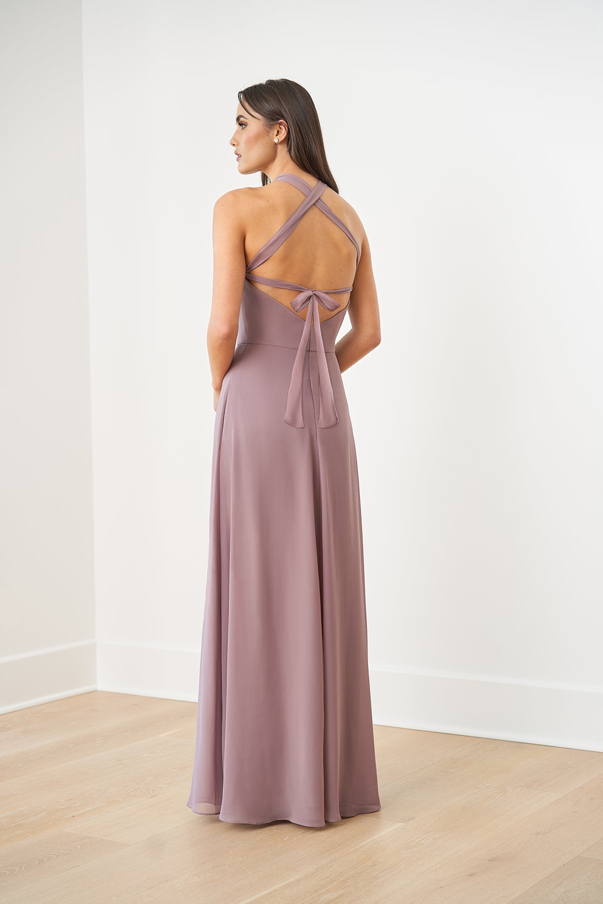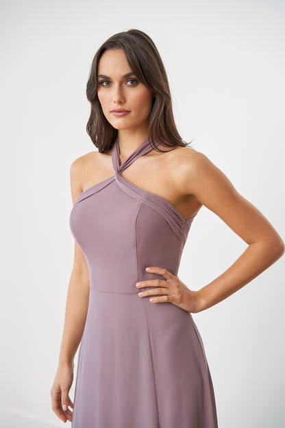 Chiffon Twist Halter Tie-Back Bridesmaid Dress