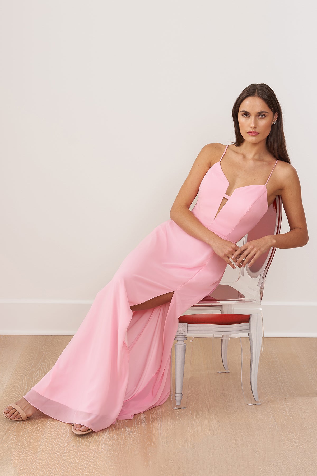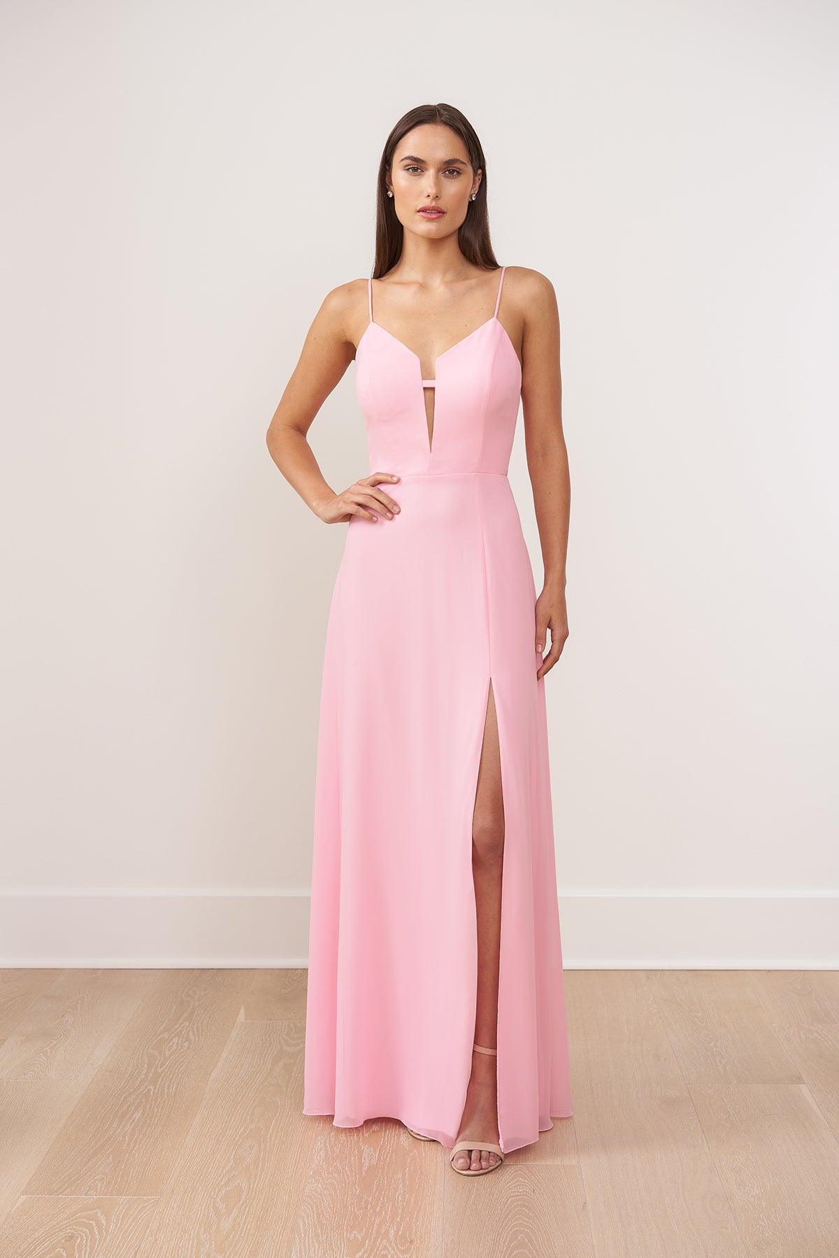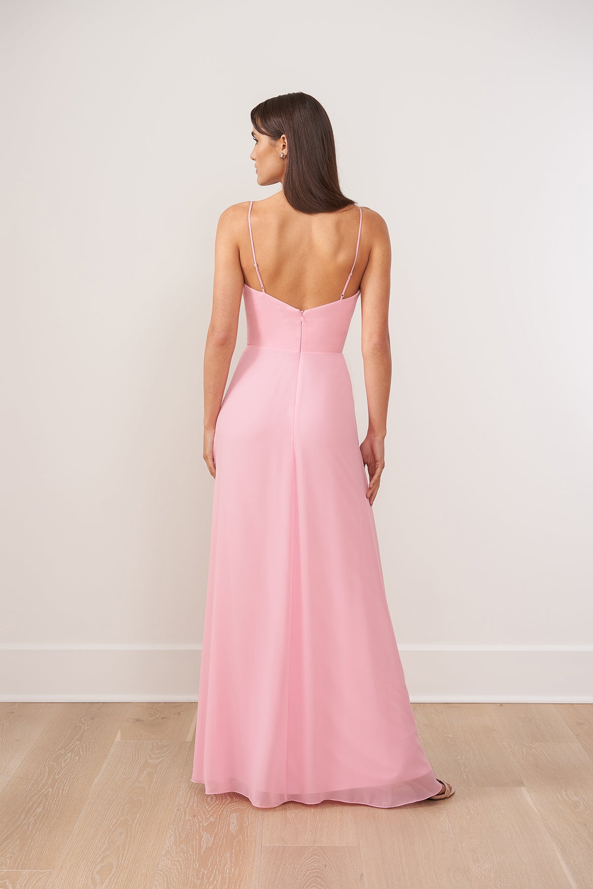 Modern and effortlessly flattering, this poly chiffon bridesmaid dress is all about the details. The sculpted bodice features a plunging V-notch neckline supported by slim adjustable spaghetti straps, offering both style and comfort. A softly flowing A-line skirt with a front slit adds graceful movement, while discreet pockets bring a touch of practicality to this fresh, fashion-forward look.