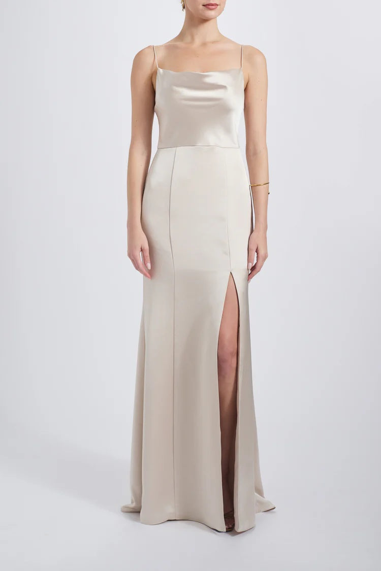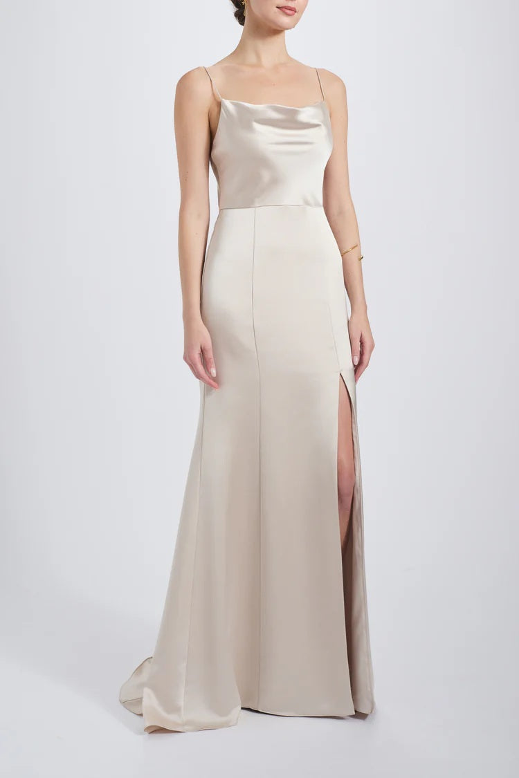 This fluid satin bridesmaid dress features a softly draped bodice supported by delicate straps, creating a graceful, flattering fit. The fit-to-flare silhouette is elevated with a low backline and high skirt slit—adding a touch of sultry charm without stealing the spotlight. Shown in Champagne and Slate—two sleek, timeless shades perfect for any wedding palette.