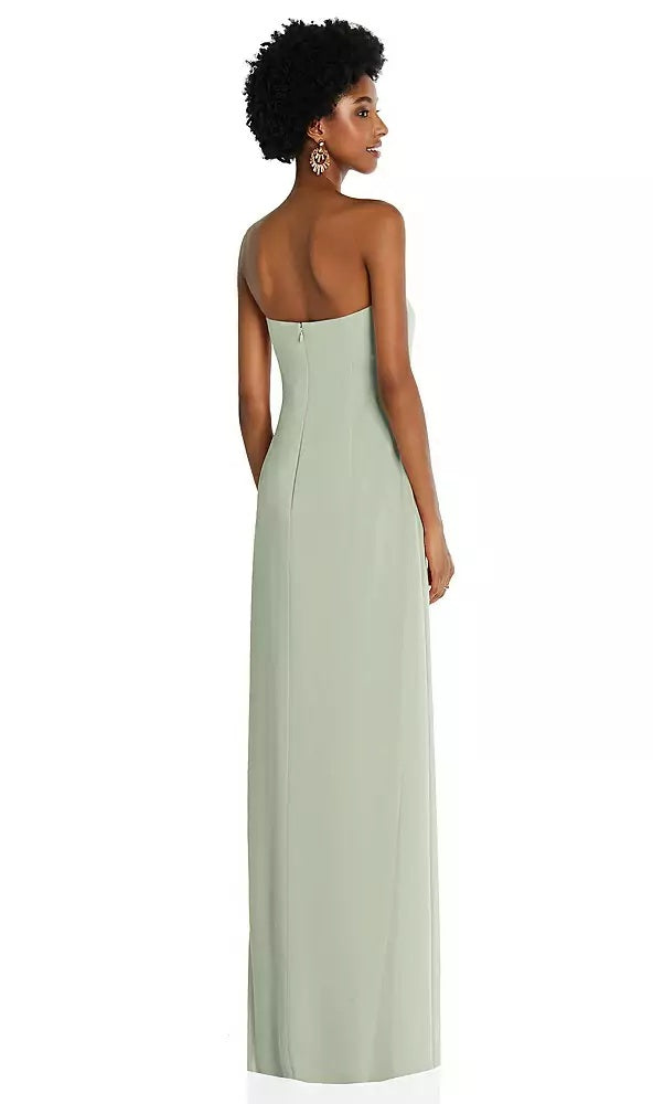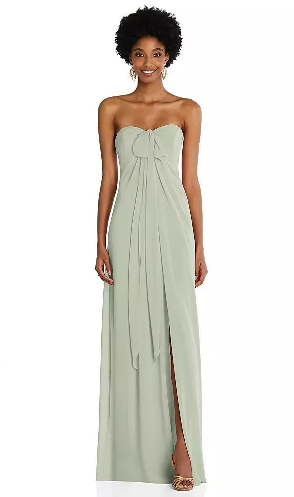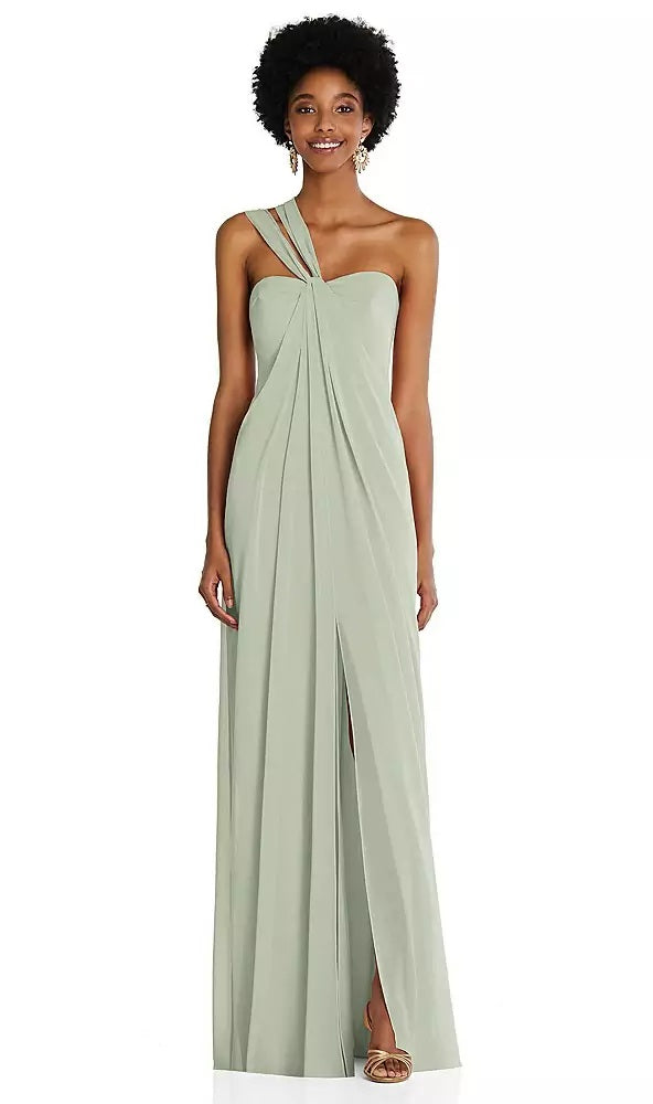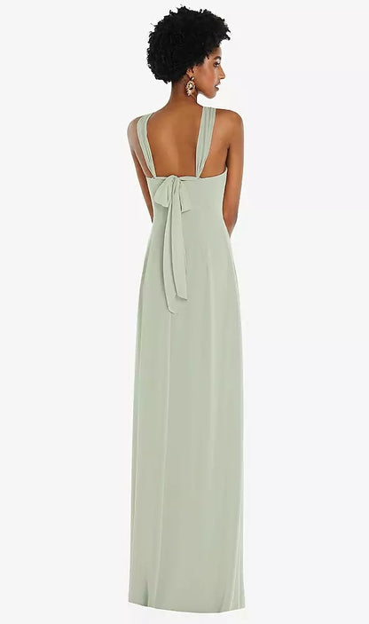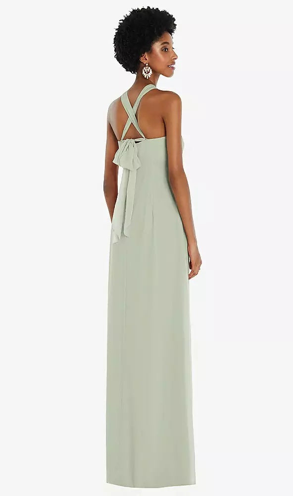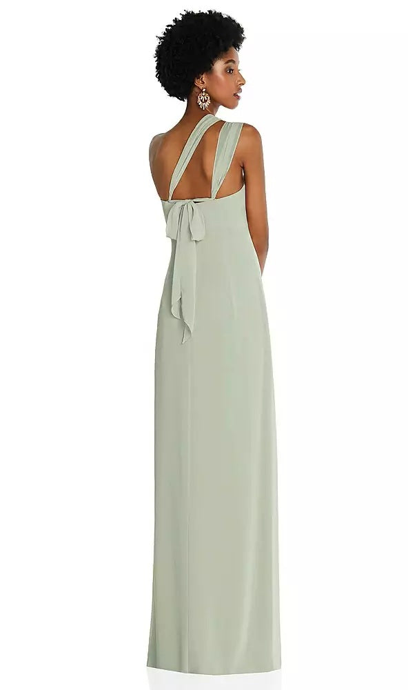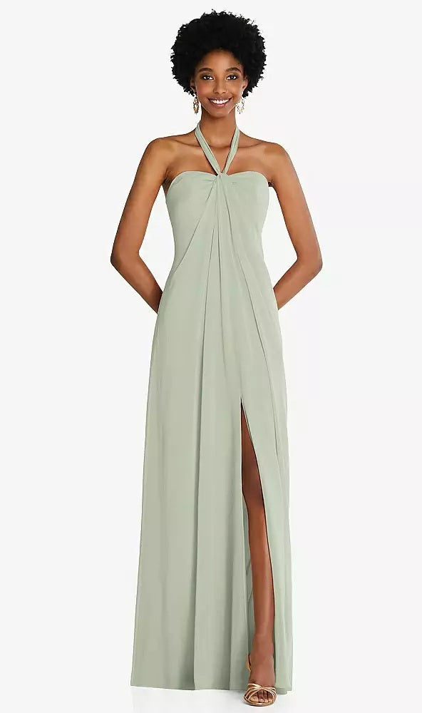 Graceful and versatile, this lux chiffon bridesmaid dress features a draped Grecian-inspired column silhouette with convertible tie straps that can be styled as a halter, one-shoulder, or strapless look. The flowing skirt flatters effortlessly—perfect for bridesmaids at every stage of life—and includes a front slit for easy movement and a modern touch of elegance.