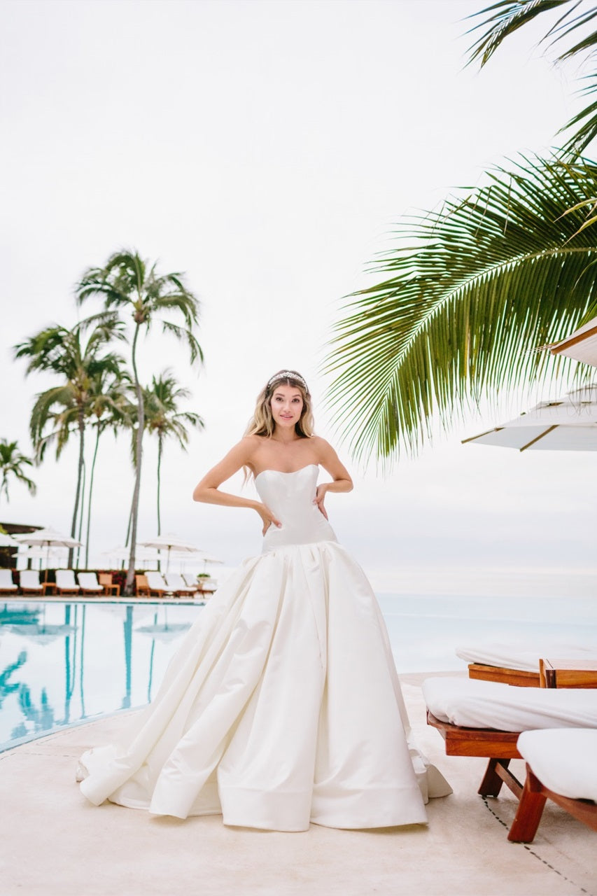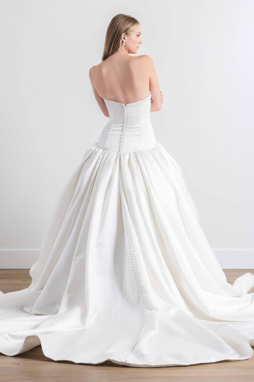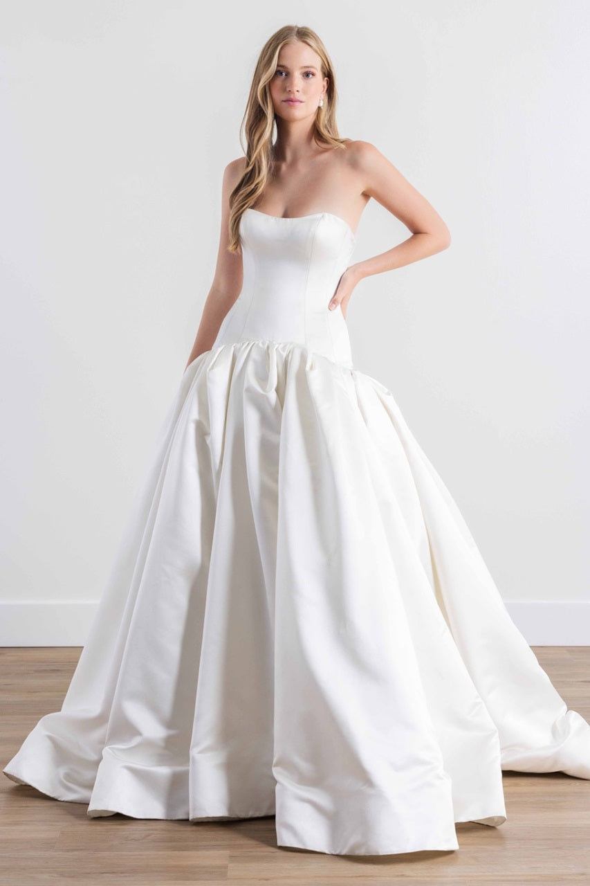 The Cordell gown is a show-stopping masterpiece designed to captivate. Featuring a dramatically dropped waist and a fully bonded bodice for impeccable structure, this gown exudes regal sophistication. Crafted from luxurious Jewel Satin, the voluminous ballgown silhouette flows effortlessly, creating a look fit for a queen. Perfect for the bride seeking to make a bold and unforgettable statement.