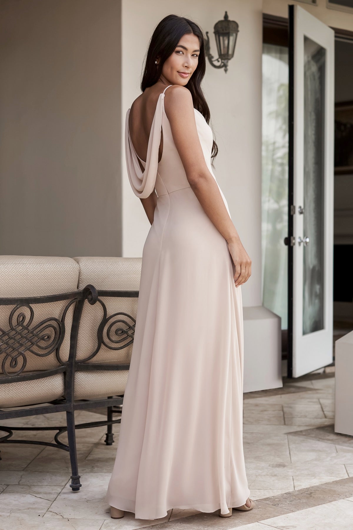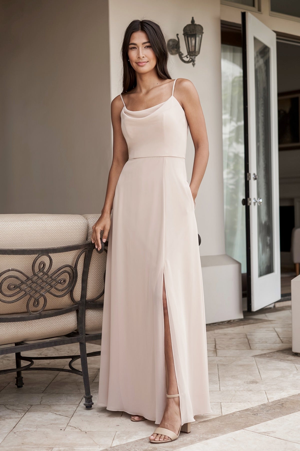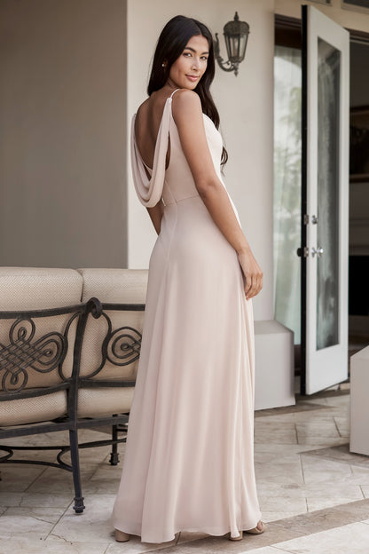Glamorous and effortlessly graceful, this poly chiffon bridesmaid dress is a true statement of chic sophistication. The soft cowl necklines in both the front and back create a romantic drape, while delicate shoulder straps add an elegant frame. The flowy A-line skirt features a subtle front slit and hidden pockets, blending form and function for a look that’s as refined as it is wearable.