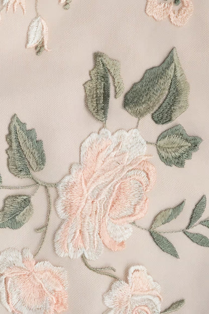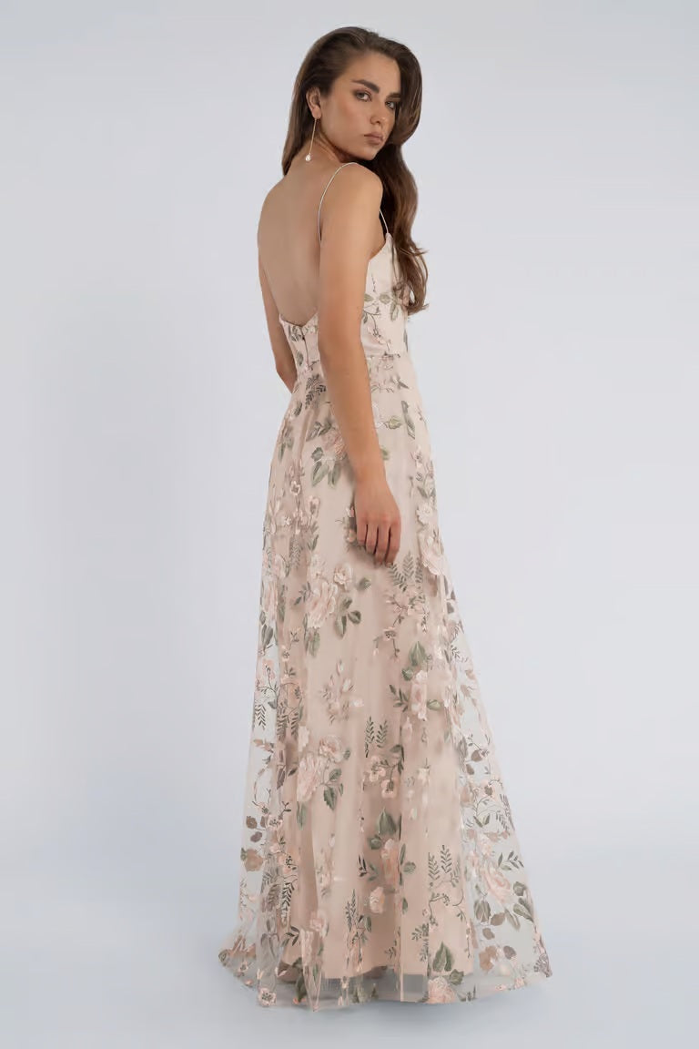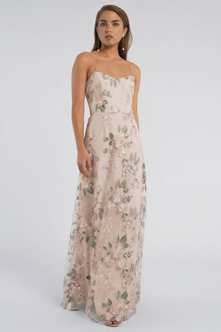 Minimalist with a romantic twist, the Drew bridesmaid dress brings soft structure to an ethereal floral design. Made from intricately embroidered Enchanted Floral tulle, this style features a 90s-inspired scoop neckline, slim spaghetti straps, and a flattering slim A-line skirt. Understated and elegant, it’s the perfect blend of modern simplicity and timeless charm.