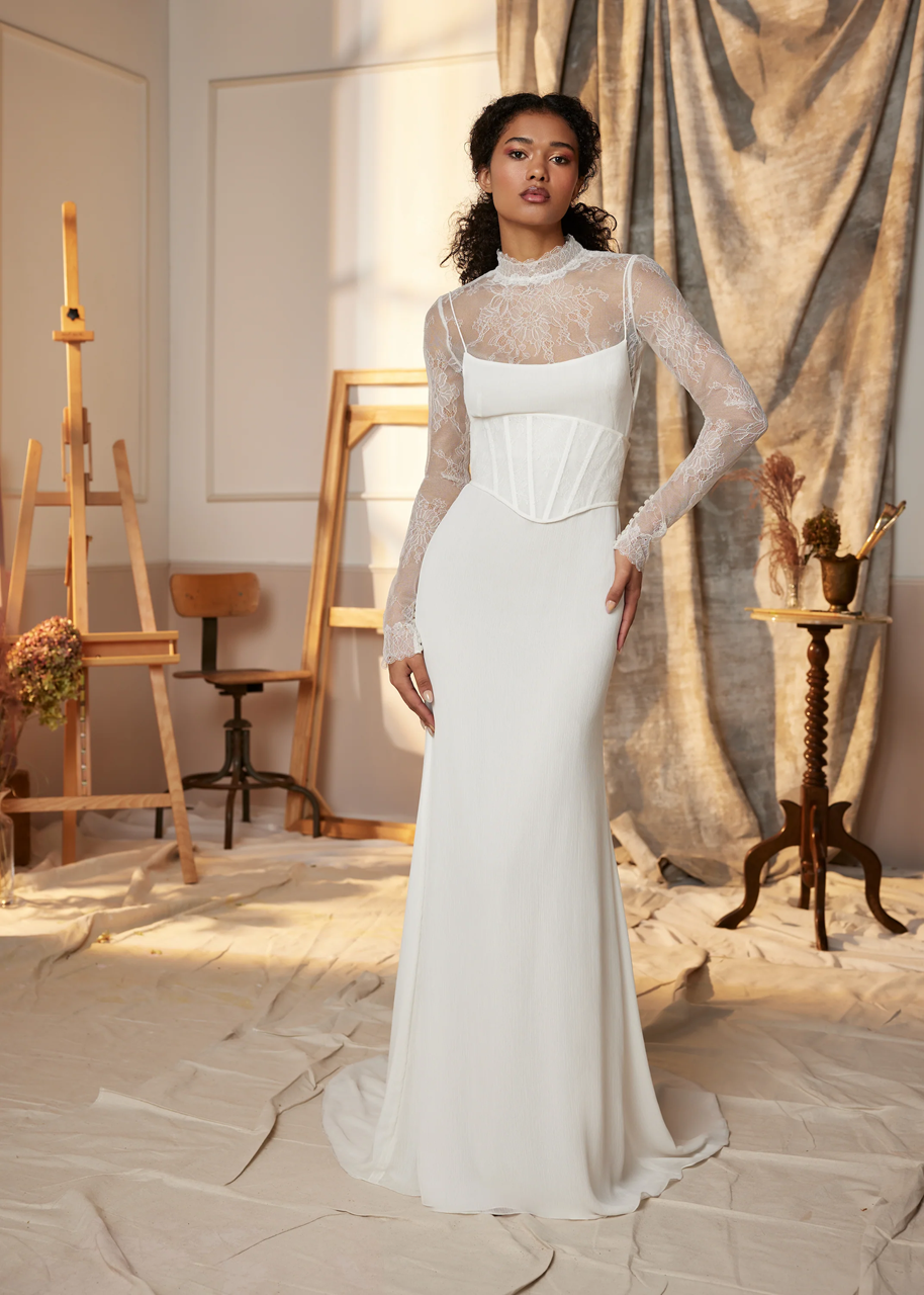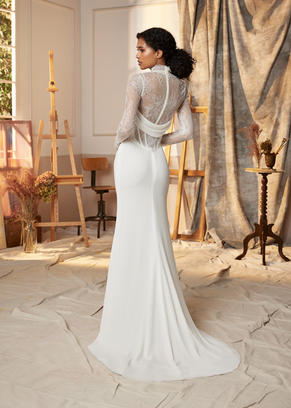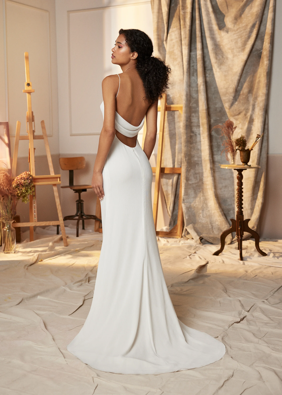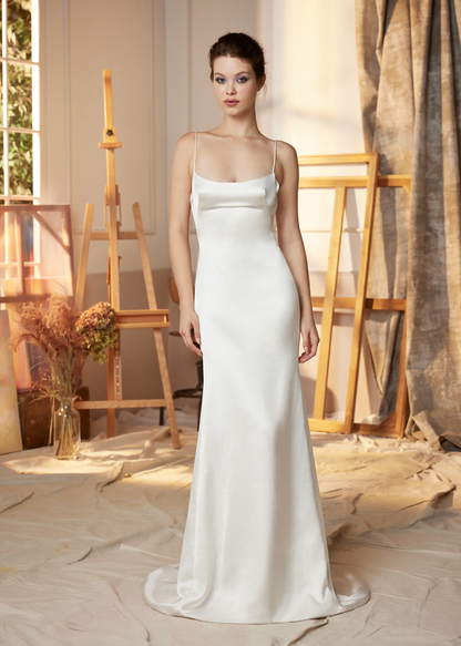 Modern, minimal, and effortlessly striking—Elixia is a sleek scoop neck sheath gown crafted from luxurious textured stretch satin. With delicate spaghetti straps, a low open back, and a removable cowl detail, this silhouette is designed to highlight your shape with graceful ease. Brides can personalize the look with an optional lace bolero or structured corset, each sold separately.
