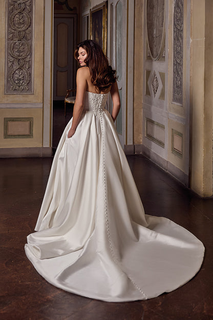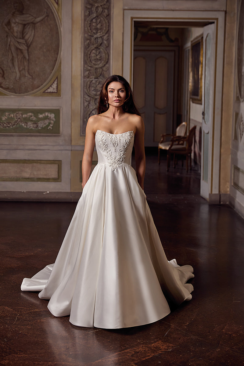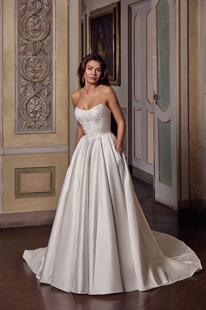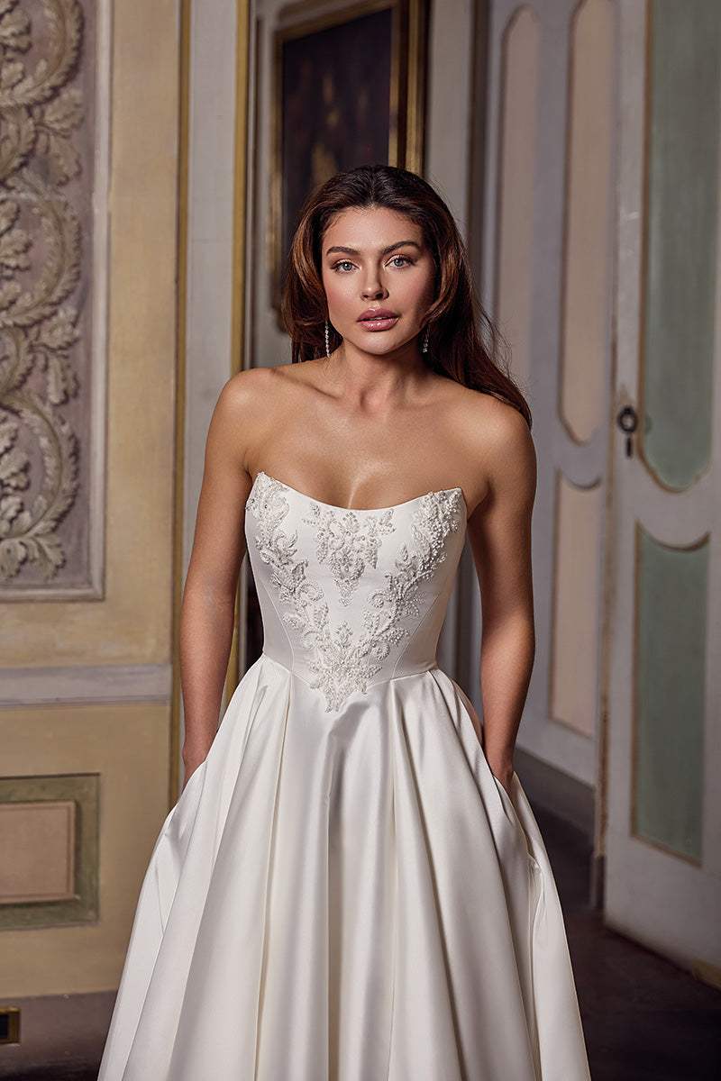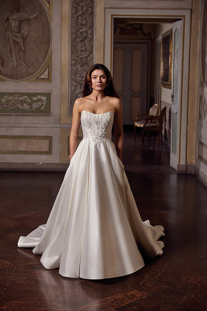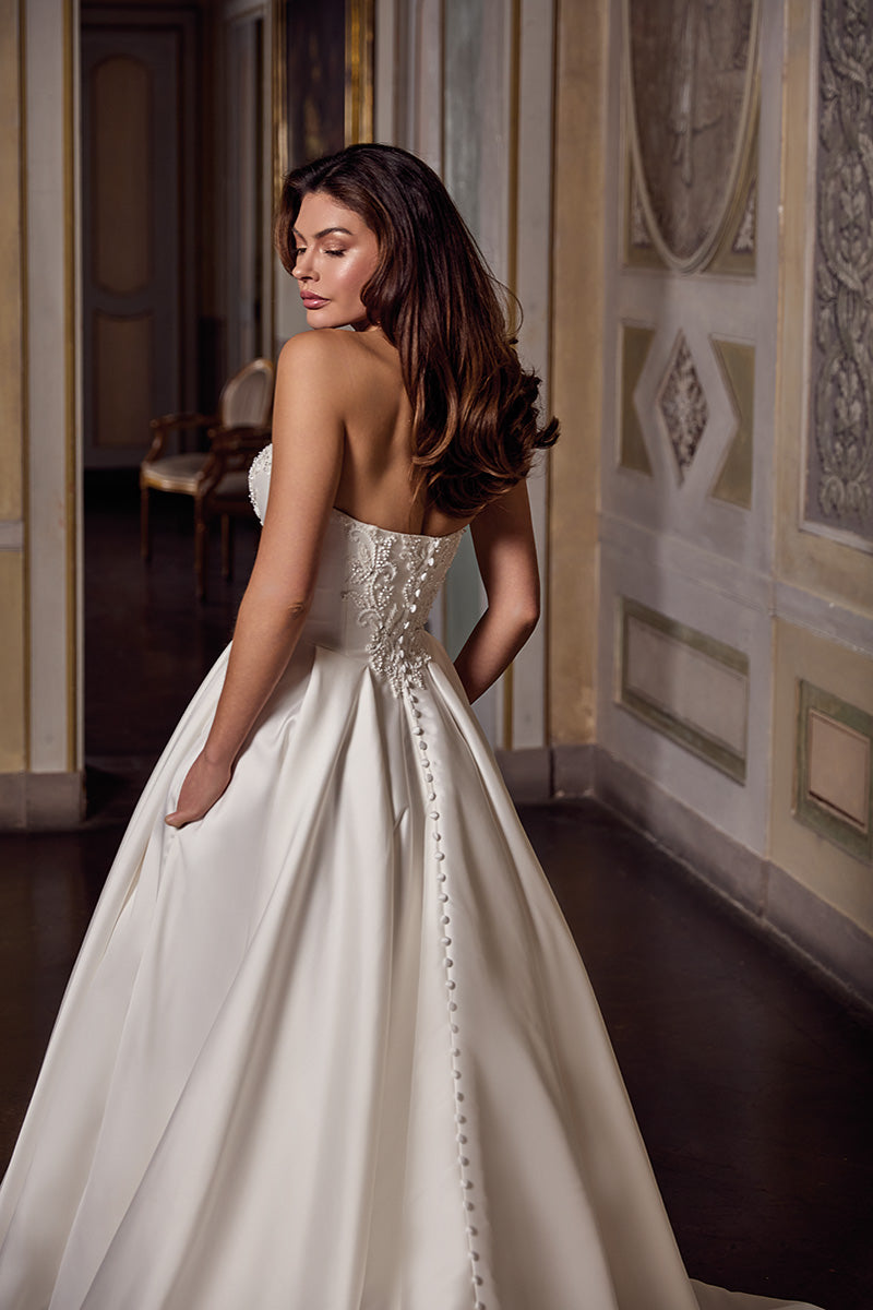 The Elowyn gown is the definition of refined elegance. Crafted in lustrous pearl ivory Mikado, this couture ballgown features intricate beaded embroidery accented with pearls, creating a look that’s both sophisticated and regal. The strapless bodice showcases a classic straight neckline and a flattering basque waist that enhances the silhouette before cascading into a full, structured skirt. With hidden pockets for added charm and buttons trailing to the end of the train, Elowyn is designed to make a lasting impression from every angle.