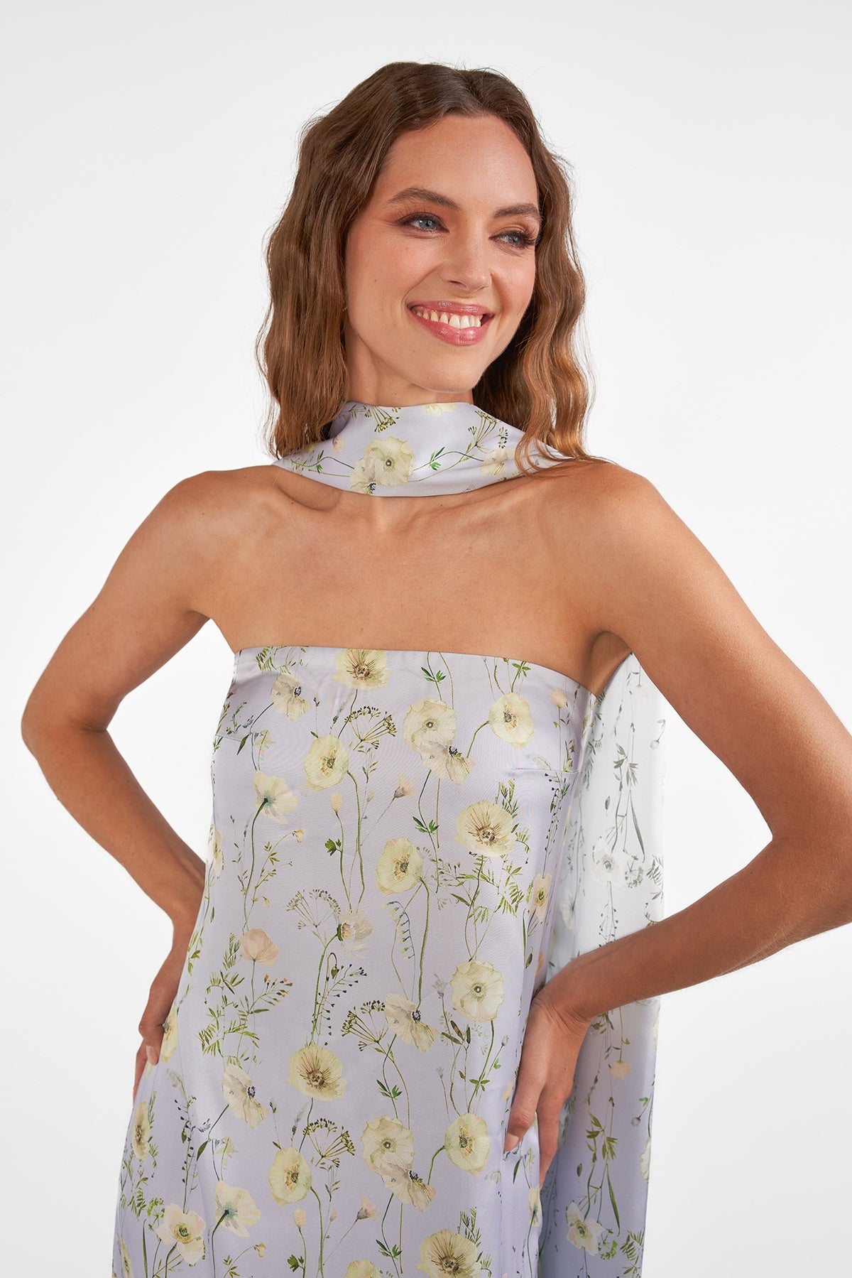 This stunning floral satin bridesmaid dress blends modern elegance with timeless romance. Designed with a strapless, straight-across neckline, it beautifully highlights the shoulders and collarbone while offering a clean, structured look. The natural waistline is accented with a matching sash, flowing effortlessly into a graceful A-line skirt that flatters every figure. Crafted from smooth floral-printed satin, this gown brings a fresh, polished feel to any bridal party—from formal celebrations to elevated garden weddings.