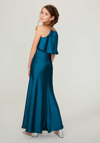This sleek silky satin junior bridesmaid dress features a flounced bodice for a fun, youthful touch and delicate spaghetti straps for a modern feel. The smooth satin fabric adds just the right amount of shine, perfect for your youngest bridal party member.