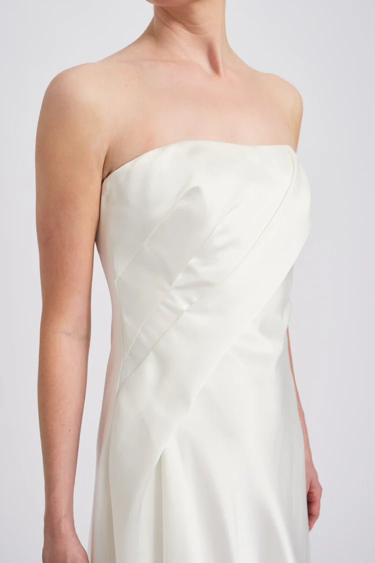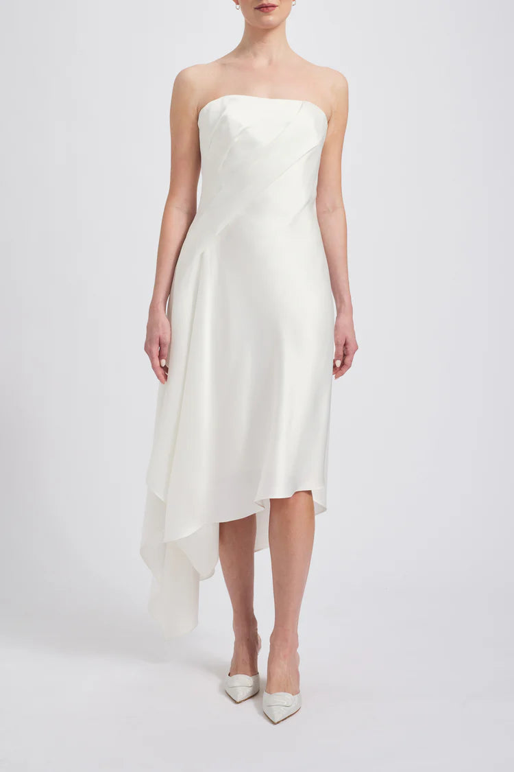 Effortless and modern, this fluid satin asymmetric dress is a fresh take on the classic little white dress. Featuring a chic strapless neckline, the draped design and handkerchief hem create soft movement, adding a touch of contemporary elegance. Perfect for a rehearsal dinner, reception, or any bridal event, this minimalist yet striking piece is ideal for the fashion-forward bride.