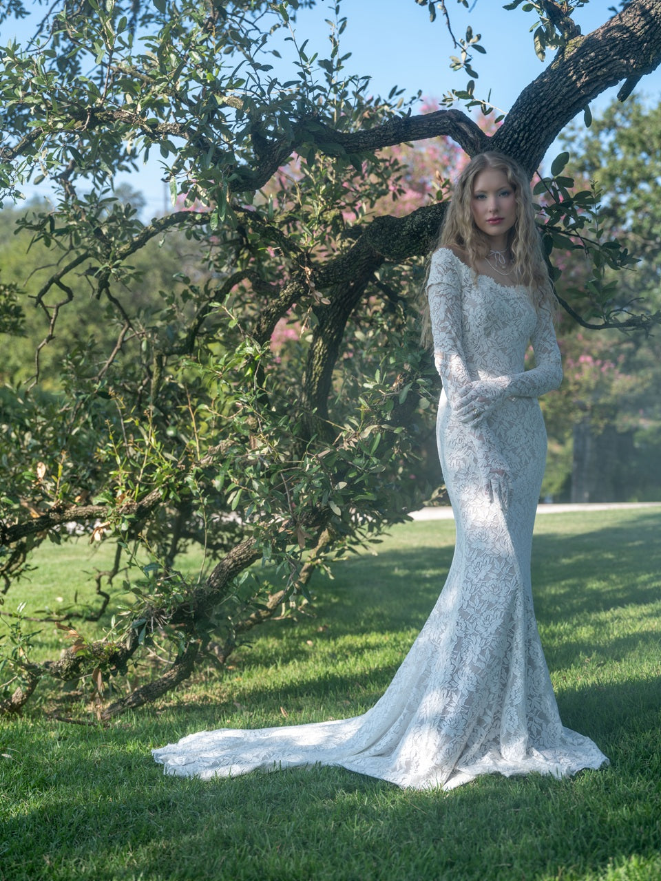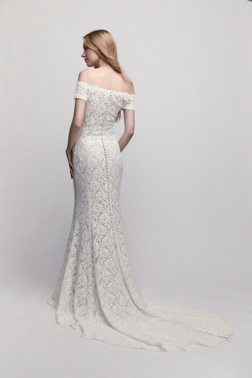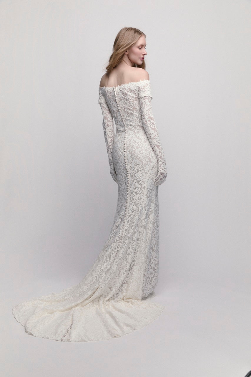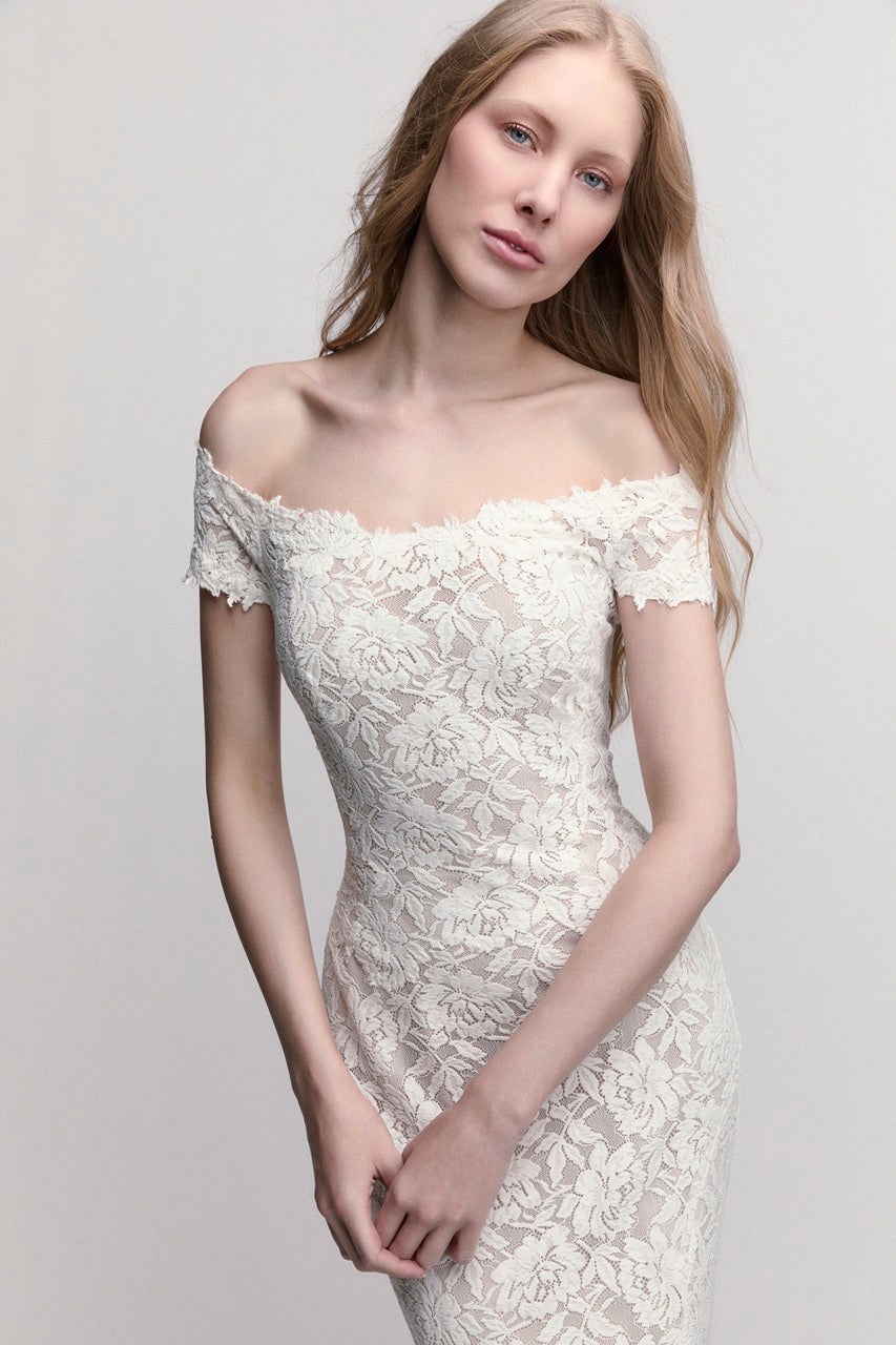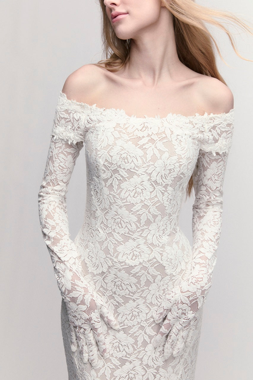 Franziska with Gloves is a romantic off-the-shoulder sheath crafted in stretch Rose Lace that contours the body with effortless ease. The sculpted lace creates impact while remaining soft and fluid, shaping a silhouette that feels modern yet timeless. Matching lace gloves extend the texture from shoulder to fingertip, adding a cinematic, fashion-forward finish. A chapel train completes the look with graceful movement.