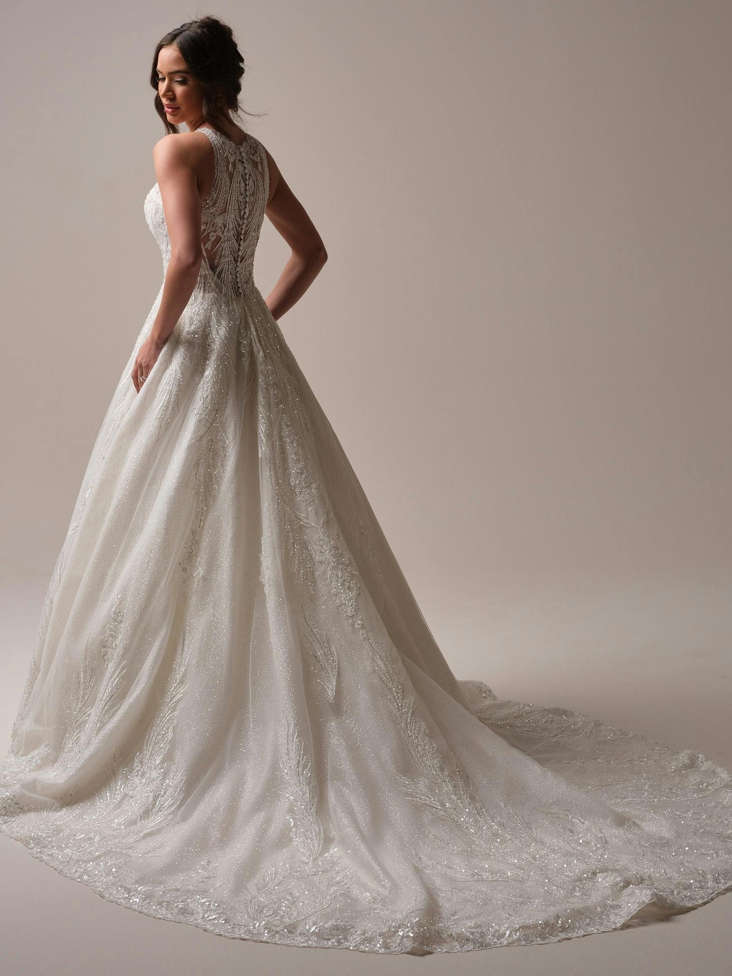 Genevieve is a beaded shimmering halter neck A-line wedding dress that redefines modern elegance. Chic yet luxurious, she features sequin lace motifs scattered over glitter tulle, creating soft layers that catch the light with every step. Her halter neckline and flattering illusion detailing bring just the right balance of sophistication and allure, making Genevieve the gown for brides who want to shine with effortless beauty.