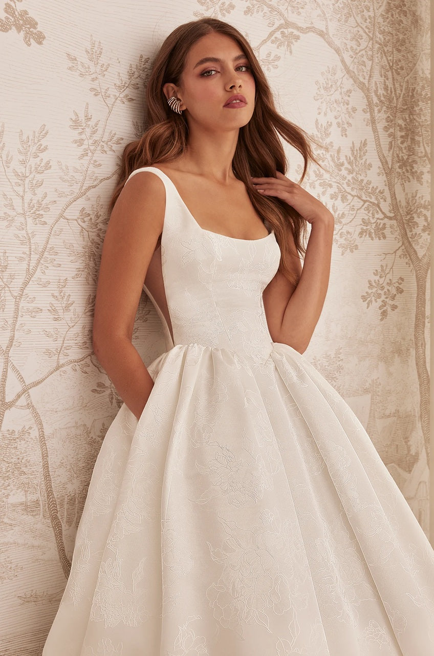 Structured yet romantic, the M2531 Jacquard Ball Gown Wedding Dress is crafted in rich jacquard for dimensional texture and timeless elegance. The sleeveless bodice features a soft scoop-square neckline with Natural Italian Tulle side inserts for subtle modern detail. Fabric-covered buttons accent the back to the waist, flowing into a full gathered skirt with a flat front panel and hidden pockets. A detachable back bow completes the look with refined drama.