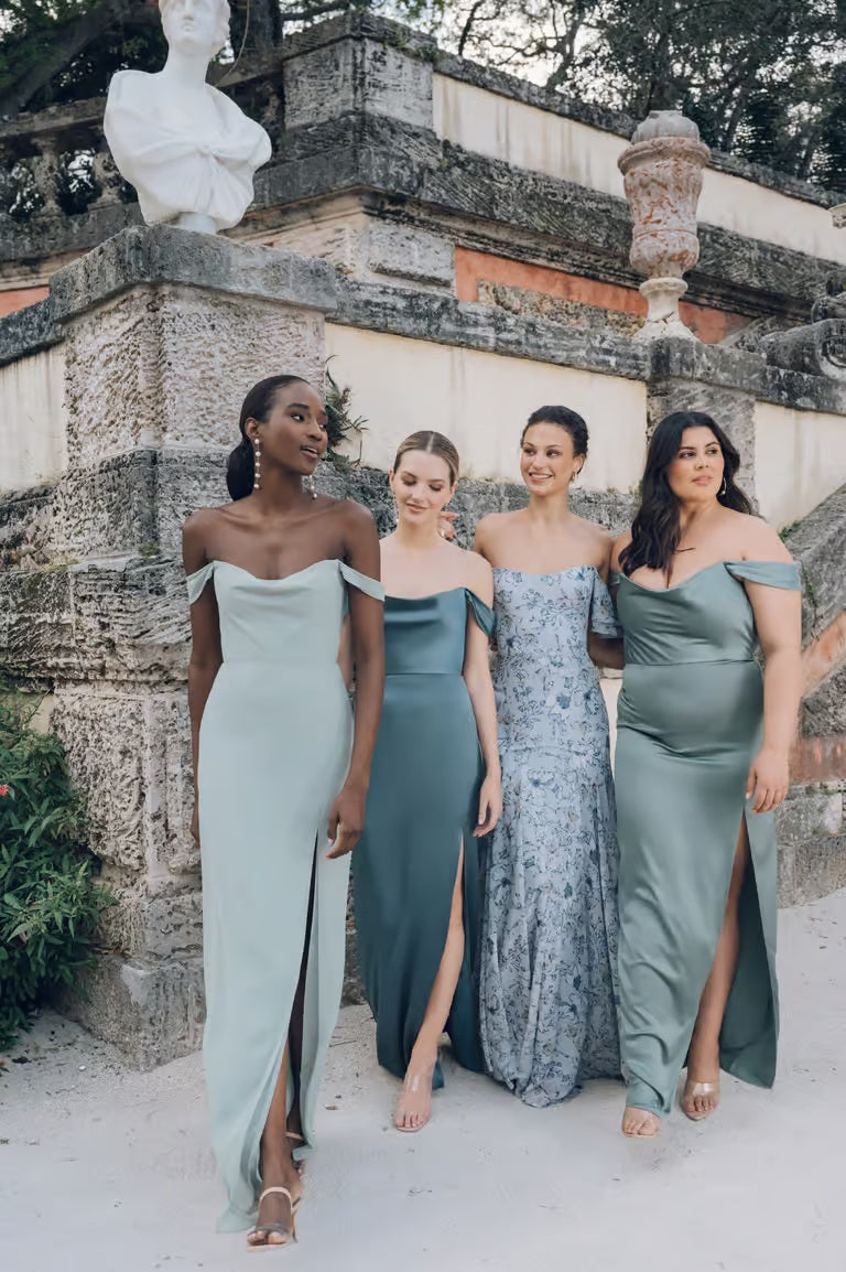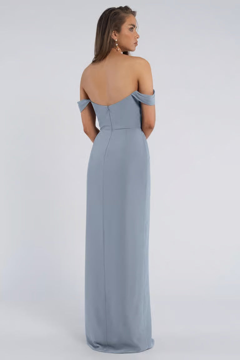 Elegant and alluring, the Jacqueline bridesmaid dress features a soft cowl neckline and gracefully draped off-the-shoulder sleeves for timeless romance. Crafted from luxe chiffon, the fully boned bodice with built-in bust cups offers structured support and a flattering silhouette. The slim pegged skirt is finished with a cutaway princess seam slit, adding just the right amount of modern edge to this classic look.