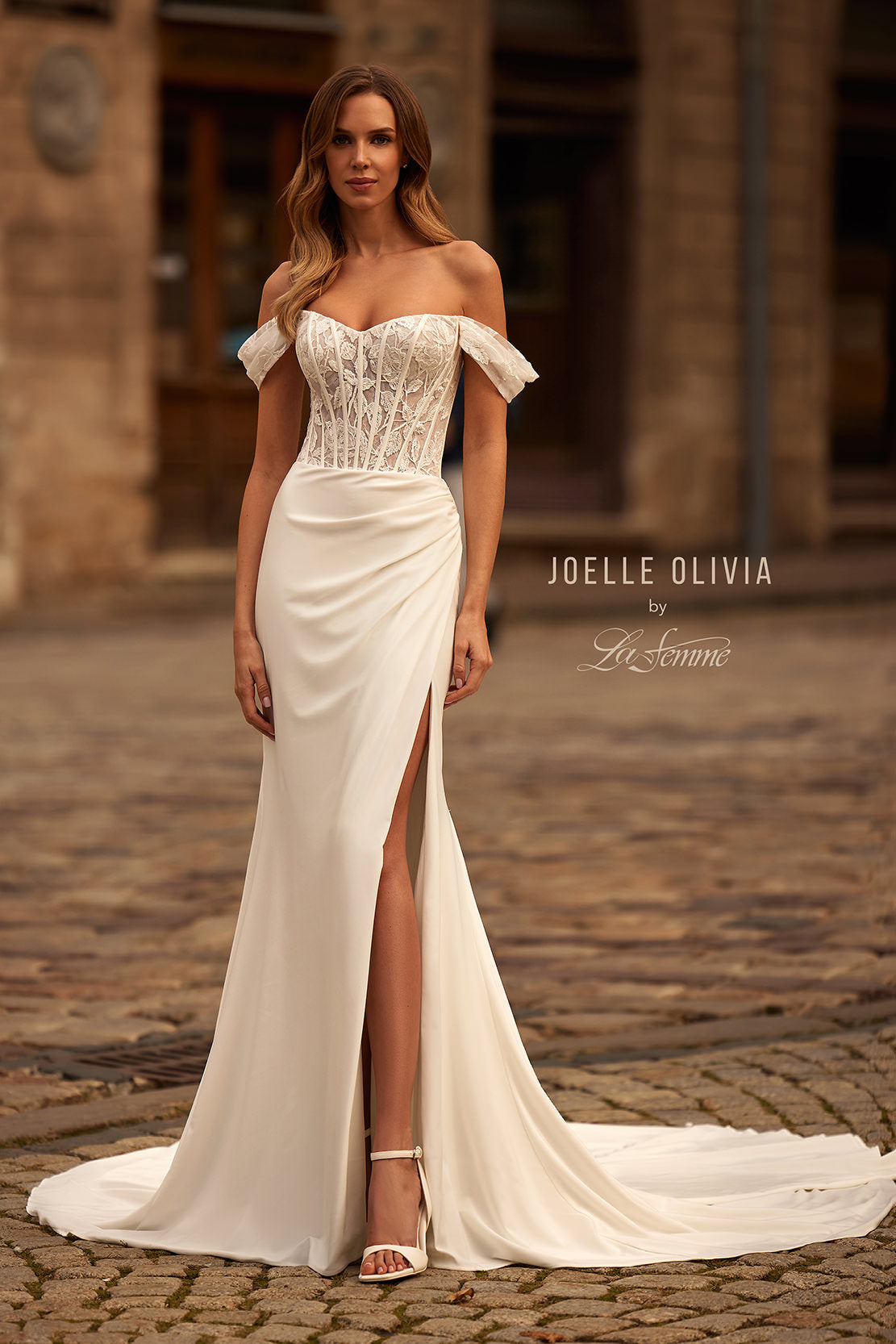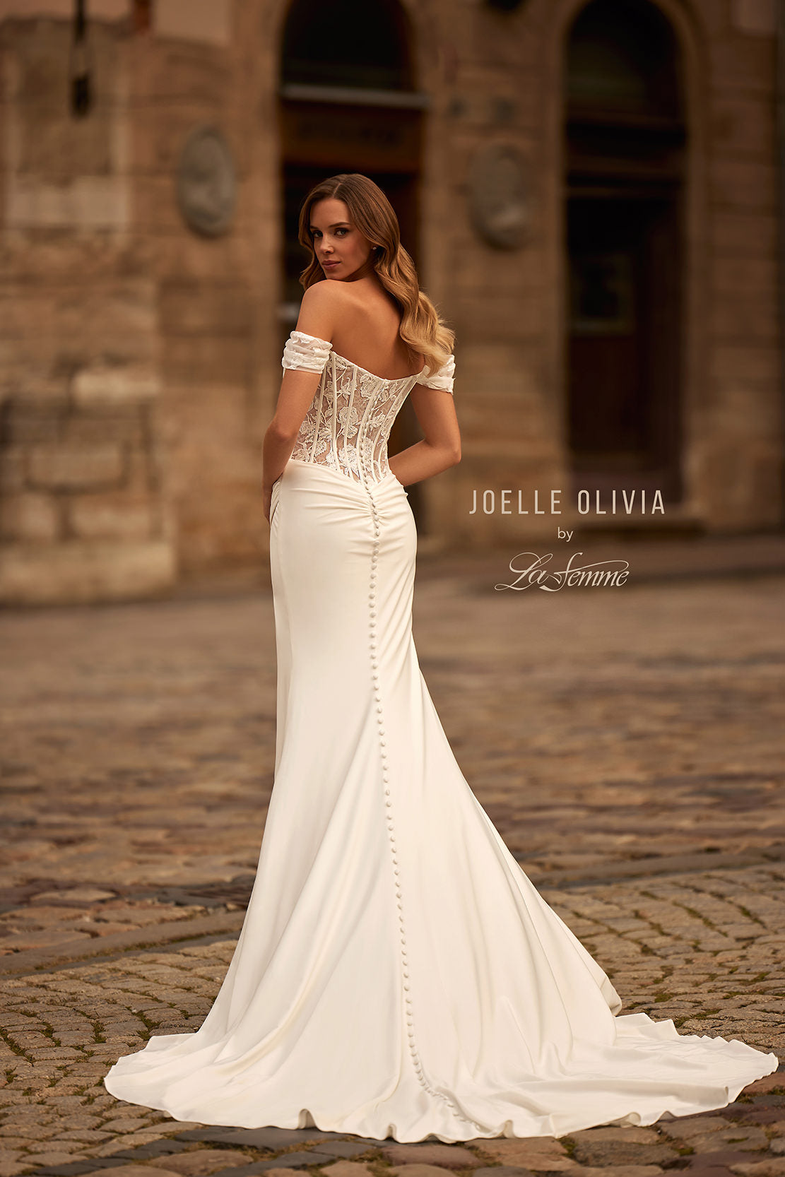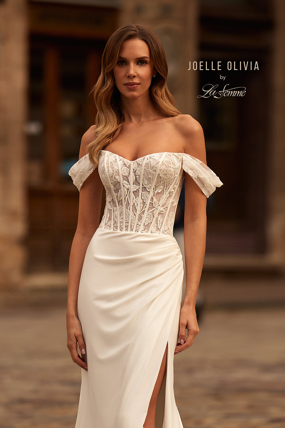 This romantic off-the-shoulder wedding dress exudes elegance with delicate sheer lace detailing across the bodice and a sweetheart neckline that highlights the décolletage. The structured bodice with visible boning offers a corset-inspired fit, while a high slit adds a touch of allure to the flowing skirt. The lace corset back enhances the gown’s intricate detailing, leading into a soft, sweeping train accented by a row of buttons for a timeless finish. Completed with a back zipper closure, this gown is stunning from every angle.