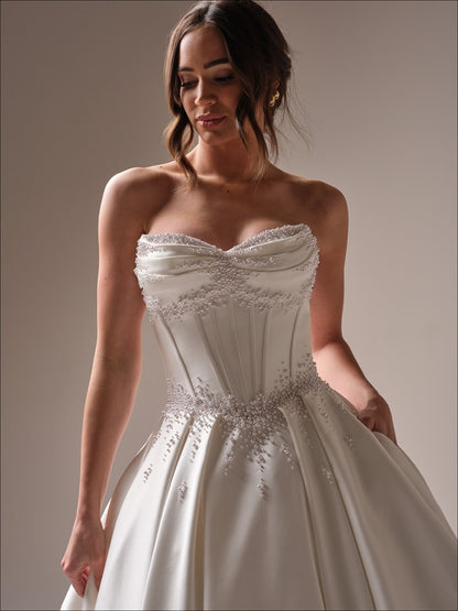 A bouquet deserves a gown that’s just as striking. Enter Juneau—an ornate pearl-accented ballgown crafted from luxe Cartago satin. The corset-style bodice shimmers with jewel-like pearls, while soft draping and a sweetheart neckline add romantic structure. Finished with a sweeping skirt, inner elastic support, pearl buttons to the hem, and hidden pockets, this silhouette is angelic from every angle.