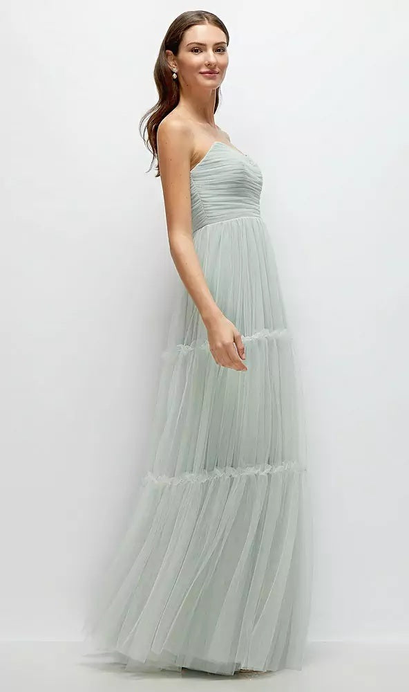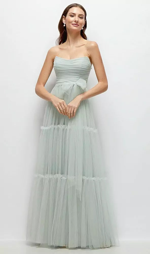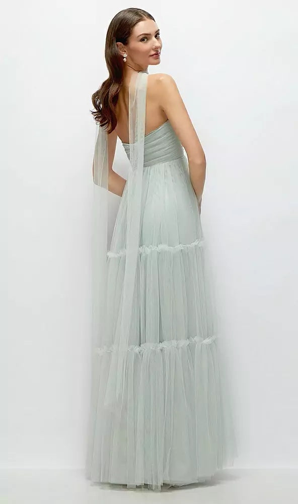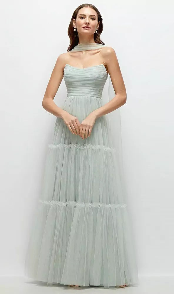 Slip into this ethereal Neu Tulle maxi dress and float through your special day in effortless elegance. The strapless bodice features a flattering cat-eye neckline with delicate shirring for a romantic, figure-enhancing fit. Layers of soft, tiered tulle create a dreamy, voluminous skirt that moves beautifully with every step. A versatile detachable sash offers styling options—wear it as a breezy neck wrap or tie it at the waist for a cinched silhouette with a bow accent.