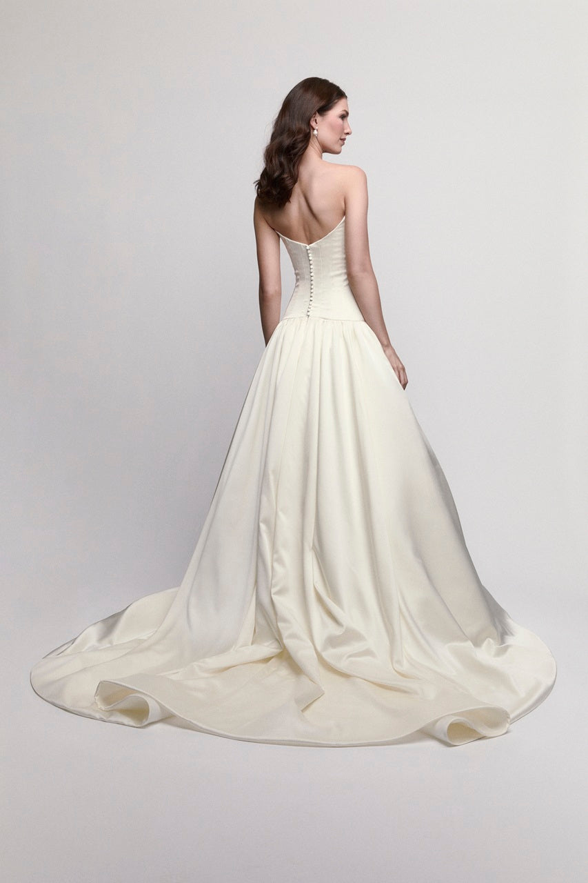 Bold and fashion-forward, the Lark Wedding Dress is a modern ballgown crafted in creamy Sutton stretch satin for soft structure and effortless movement. A wide scoop neckline and sharp bodice edges create a clean, sculptural look, while the inverted drop waist elongates the silhouette beautifully before flowing into a dramatic skirt. Finished with a chapel train, Lark is architectural bridal elegance with a luxurious, comfortable feel.