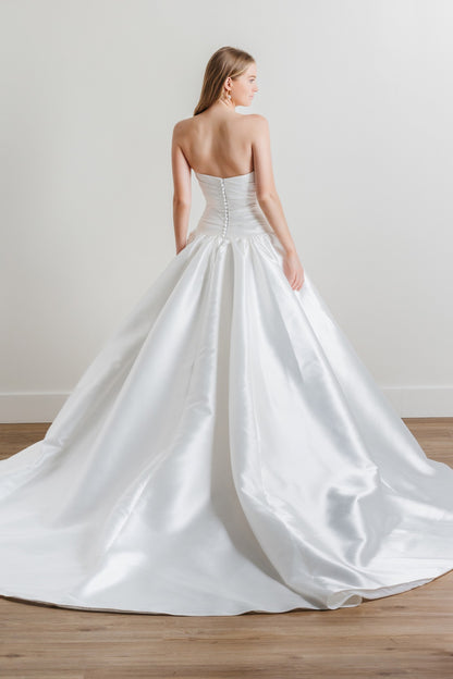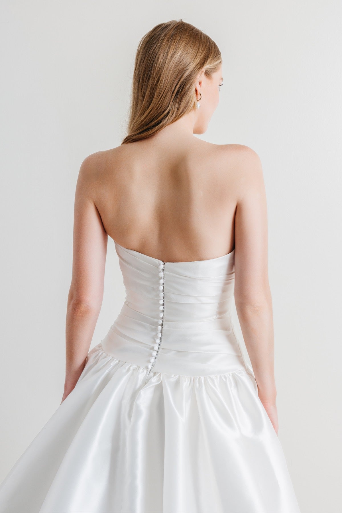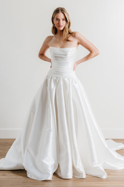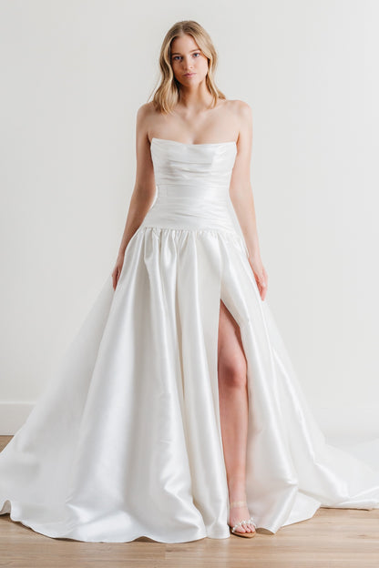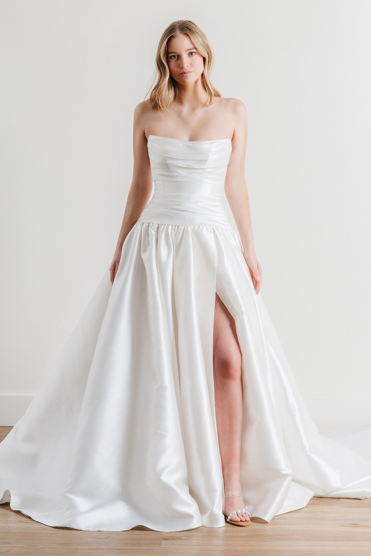 Bold, modern, and effortlessly elegant—the Leighton wedding gown by Watters Brides is a statement in structured sophistication. Crafted in luminous Mia Mikado, this strapless beauty features a softly draped bodice and defined waist that flows into a voluminous A-line skirt. A high slit adds unexpected allure and movement, perfect for the bride who wants to blend timeless romance with contemporary edge.