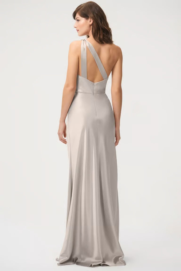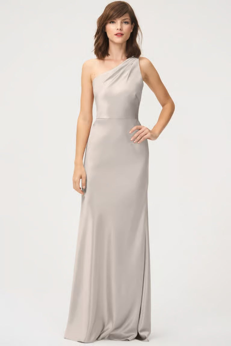 Channeling old Hollywood glamour, the Lena bridesmaid dress is a sophisticated standout. Crafted in luxurious satin back crepe, this gown features a sleek one-shoulder neckline with a softly pleated detail for added elegance. The bias-cut skirt hugs and flatters your curves, while the open strappy back adds a touch of modern allure—perfect for making an unforgettable entrance.