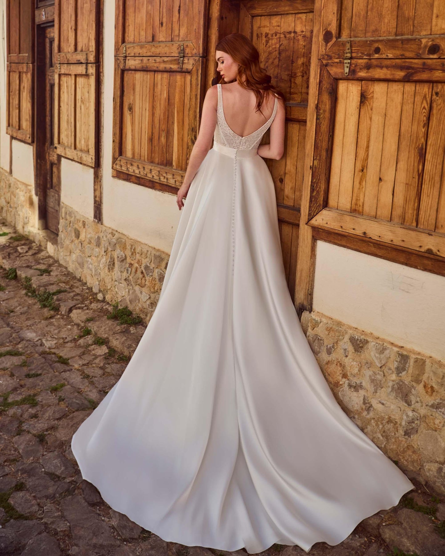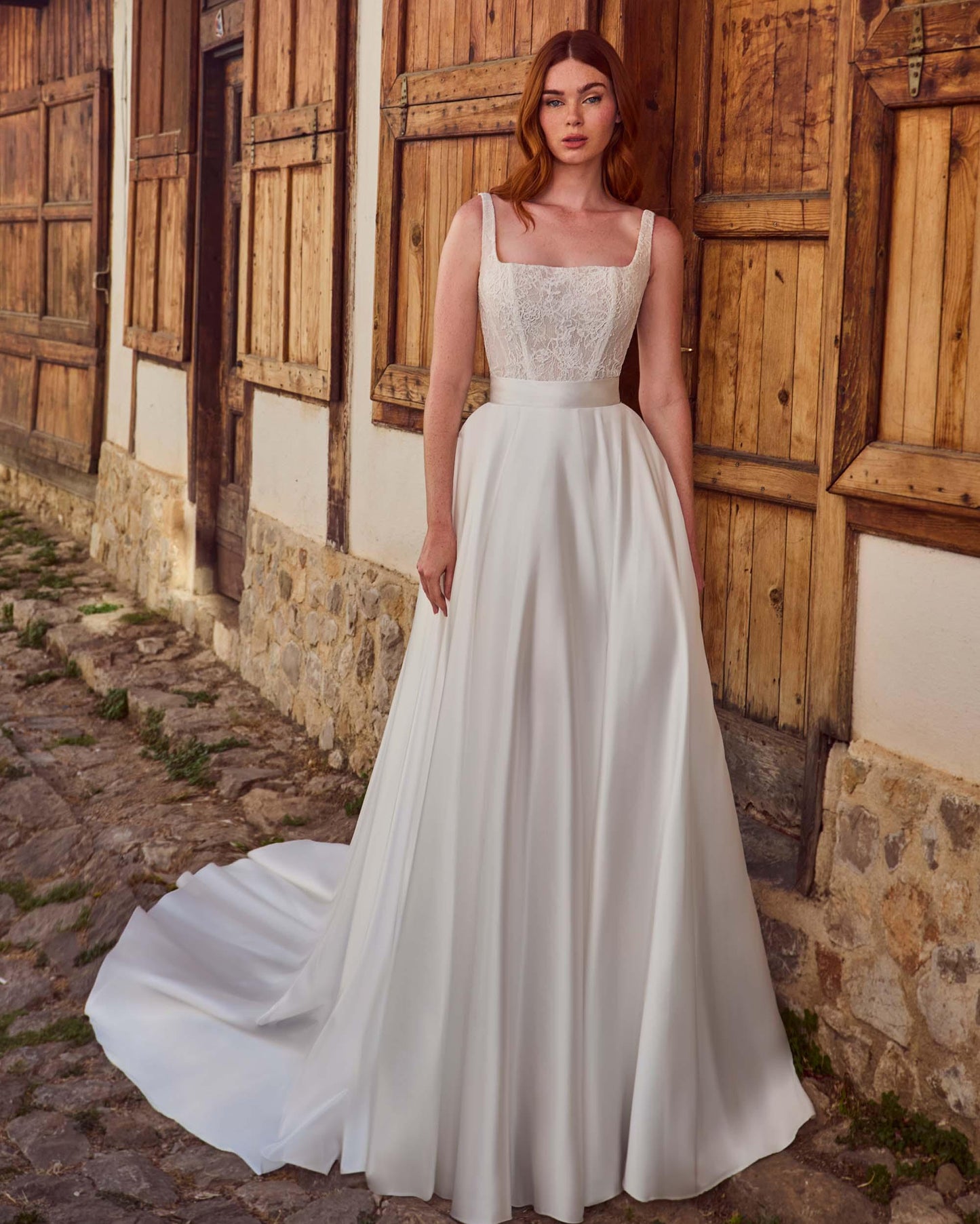Liana is the perfect blend of elegance and playfulness, designed for the bride who wants versatility without compromising on style. This stunning gown features a lace bodice with a soft square neckline and wide shoulder straps, offering vintage charm and all-night comfort. Choose the detachable satin overskirt for a classic A-line silhouette during the ceremony, or remove it to reveal a short, flirty style ideal for dancing the night away. Prefer a traditional look? Liana can also be ordered as a floor-length gown for a timeless bridal moment. Whatever you choose, Liana ensures you'll look effortlessly stunning from every angle.