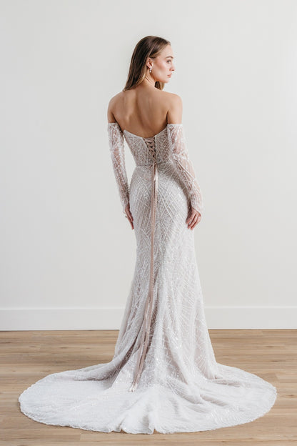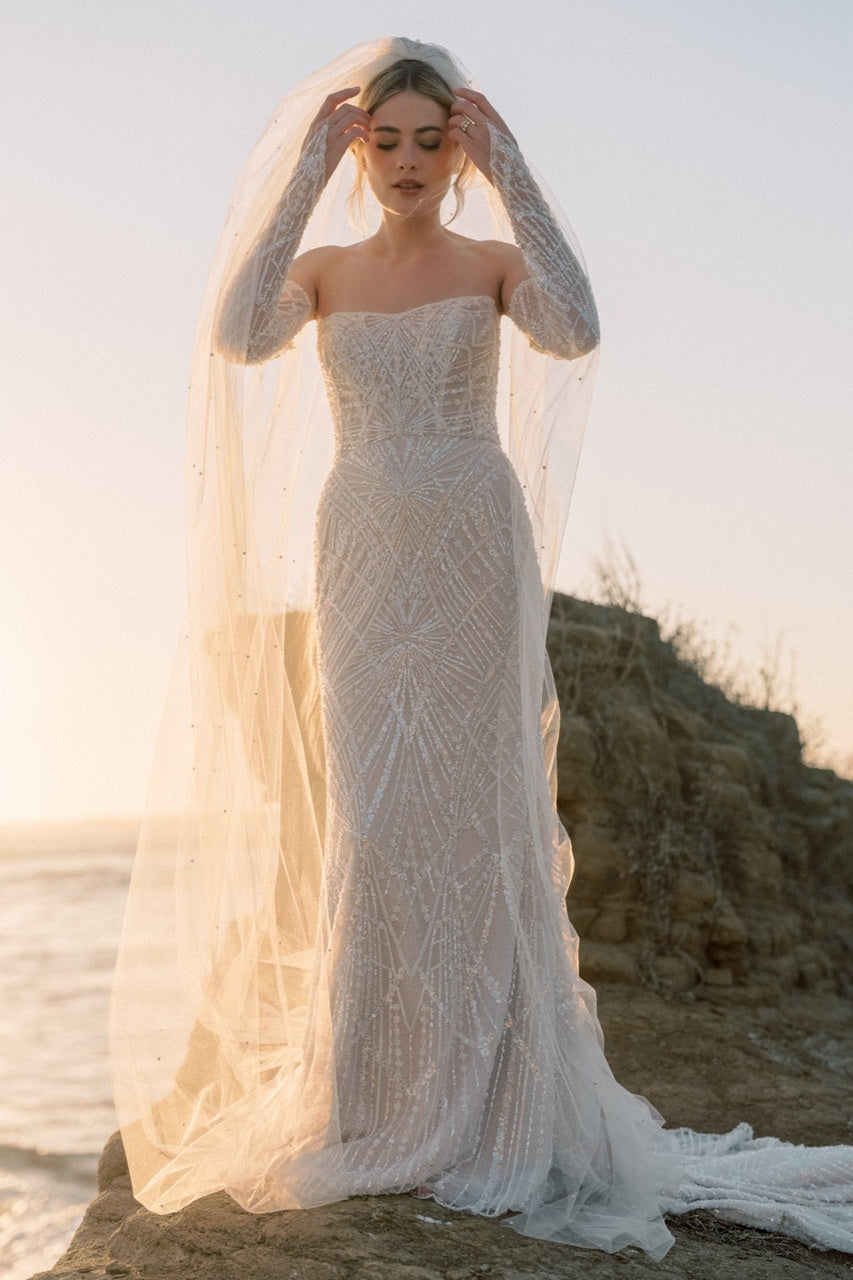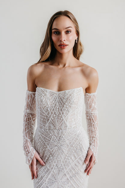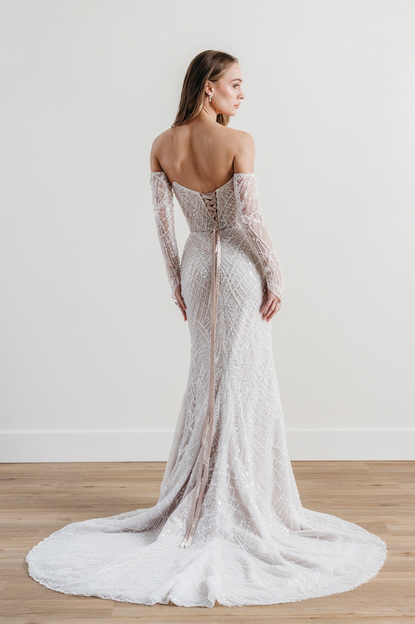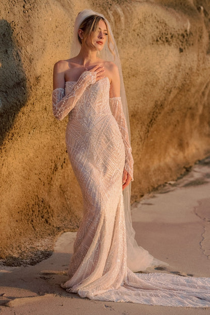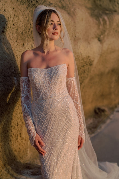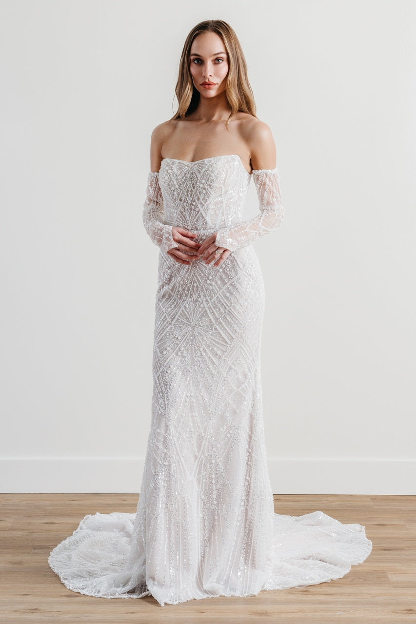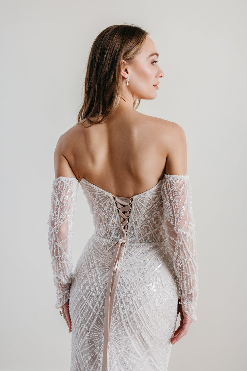 All eyes on intricate detail. The Memento gown by Wtoo is a sleek sheath silhouette adorned in dimensional beading that shimmers with every step. The structured sweetheart neckline and natural waist flatter the figure, while the detachable long sleeves add a fashion-forward edge. A lace-up back and chapel train complete the look, giving modern brides a bold, yet timeless moment.