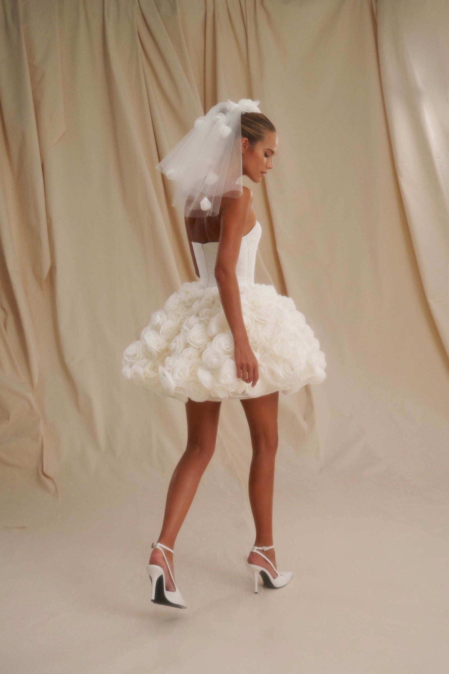 This elegant mini wedding dress is expertly crafted from Mikado and showcases a beautiful straight neckline. The skirt is adorned with intricate handcrafted rosettes made of delicate lace and organza. This stunning dress also has a matching short veil to complete the perfect wedding day look.