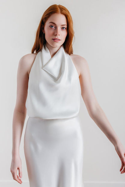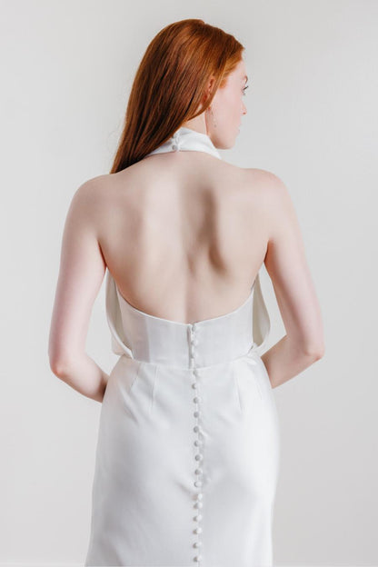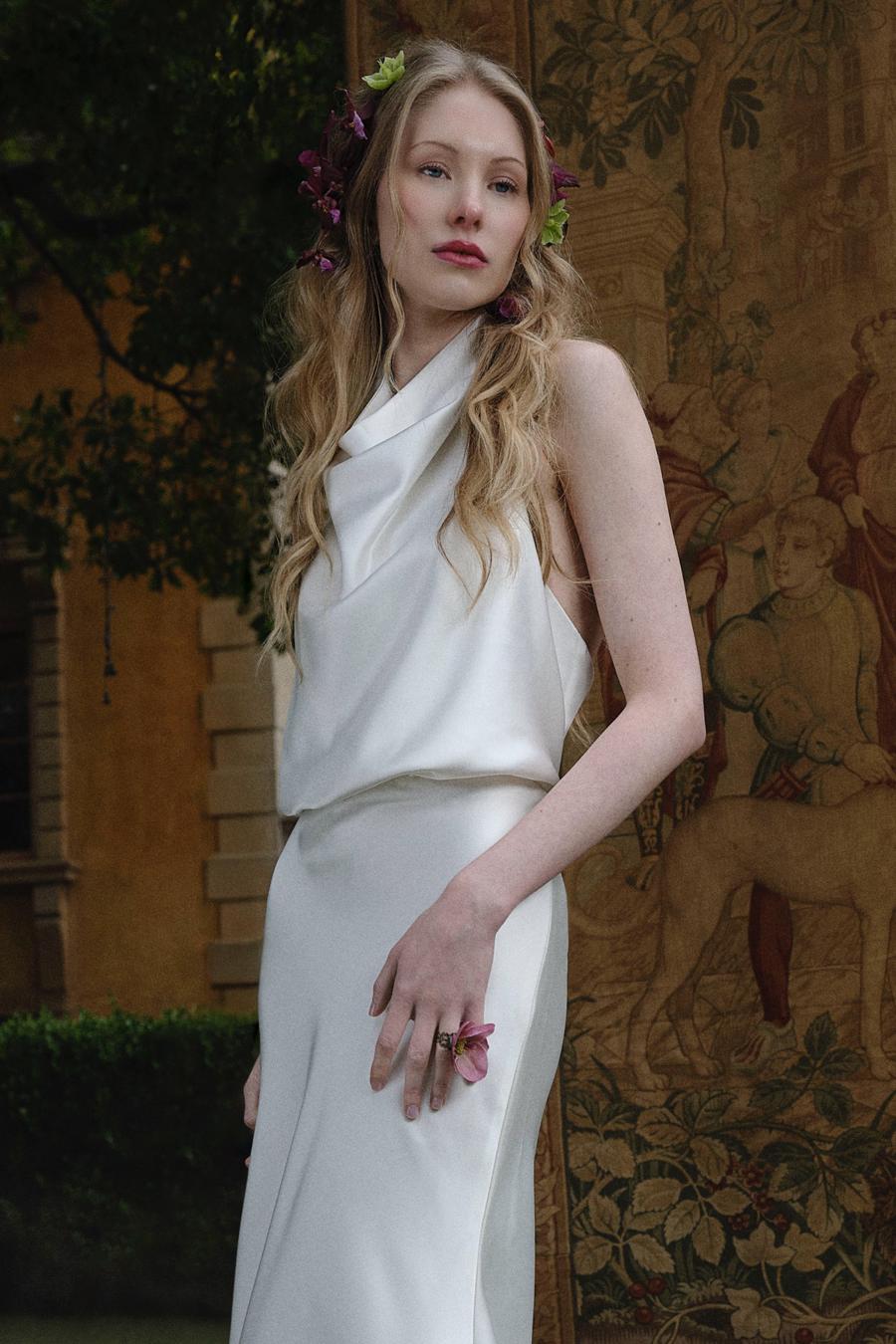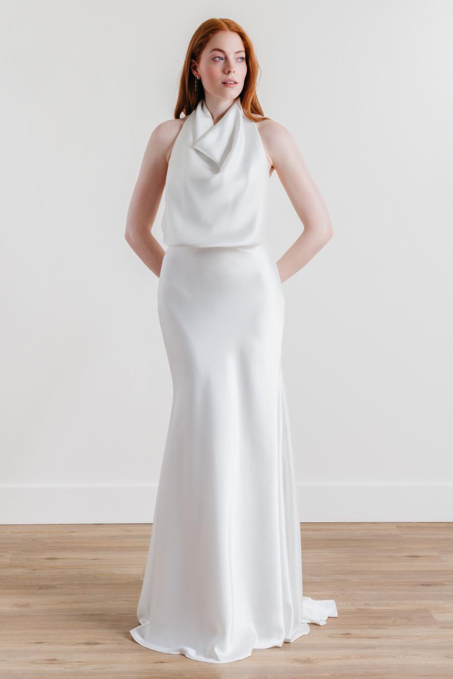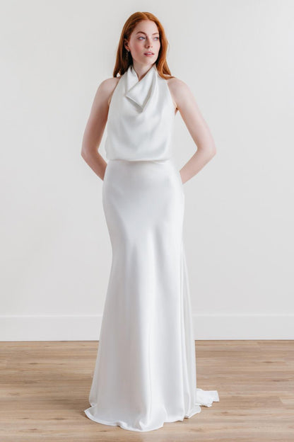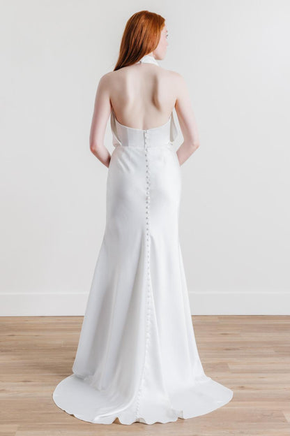 The Morgana gown by Willowby blends ethereal softness with structured elegance. A halter neckline and sculpted corset bodice offer flattering support, while the bias-cut skirt flows effortlessly with every step. For the bride who wants presence, poetry, and unforgettable grace.