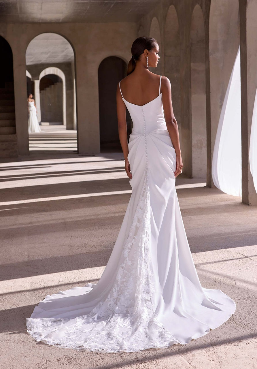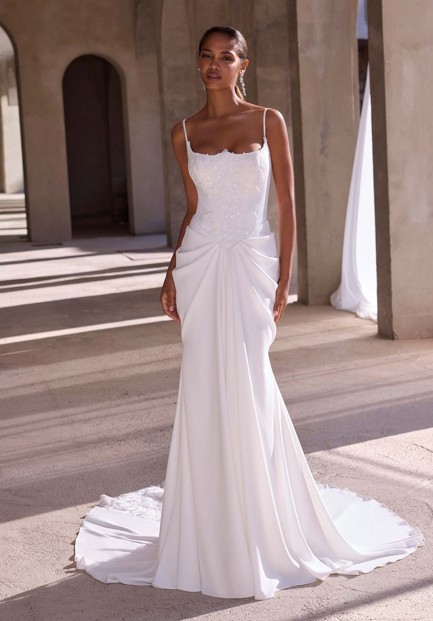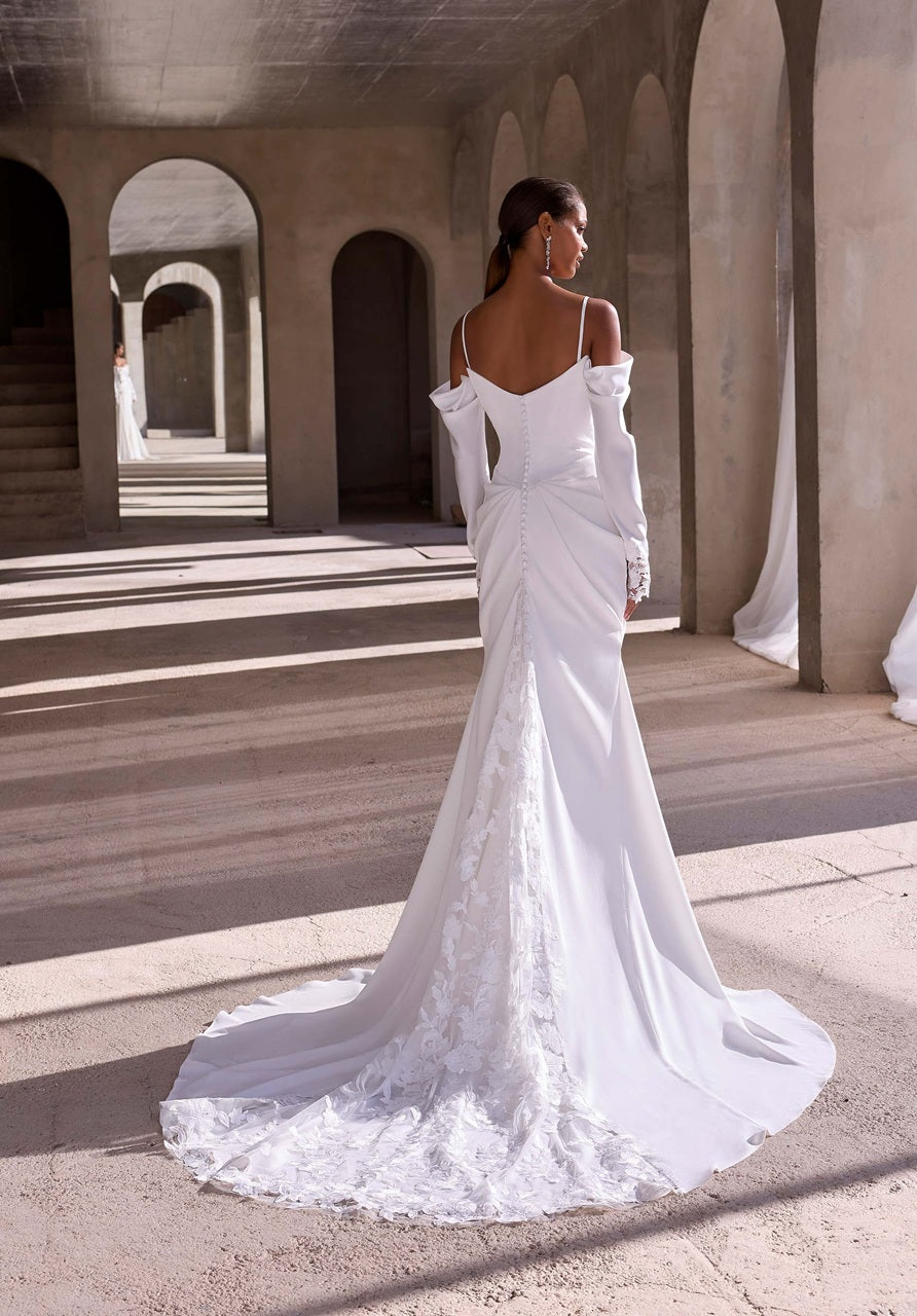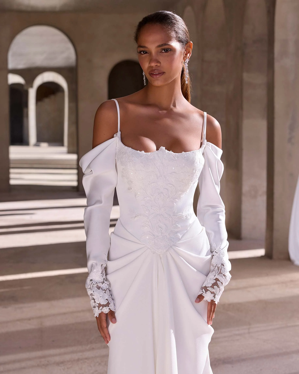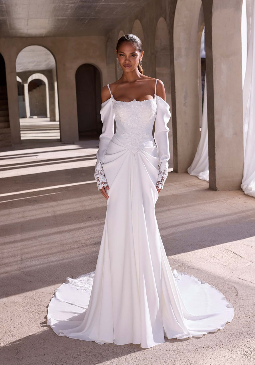 Myka is the perfect balance of ethereal elegance and sculpted sophistication. This crepe fit and flare gown features a draped basque waist and a delicately beaded embroidered bodice with a unique angel wing neckline. Thin straps and detachable long sleeves offer styling versatility, while the lace inset godet train adds soft, layered movement.