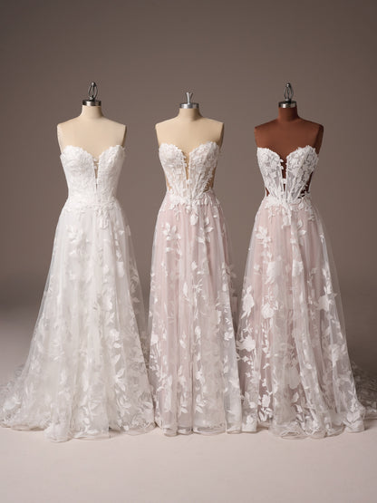 The Natalie gown is all about effortless elegance. With a flattering A-line silhouette, romantic floral lace, and subtle illusion panels, it creates a soft, captivating look. Optional off-the-shoulder sleeves let you tailor the style to your day—blending timeless charm with a modern edge.