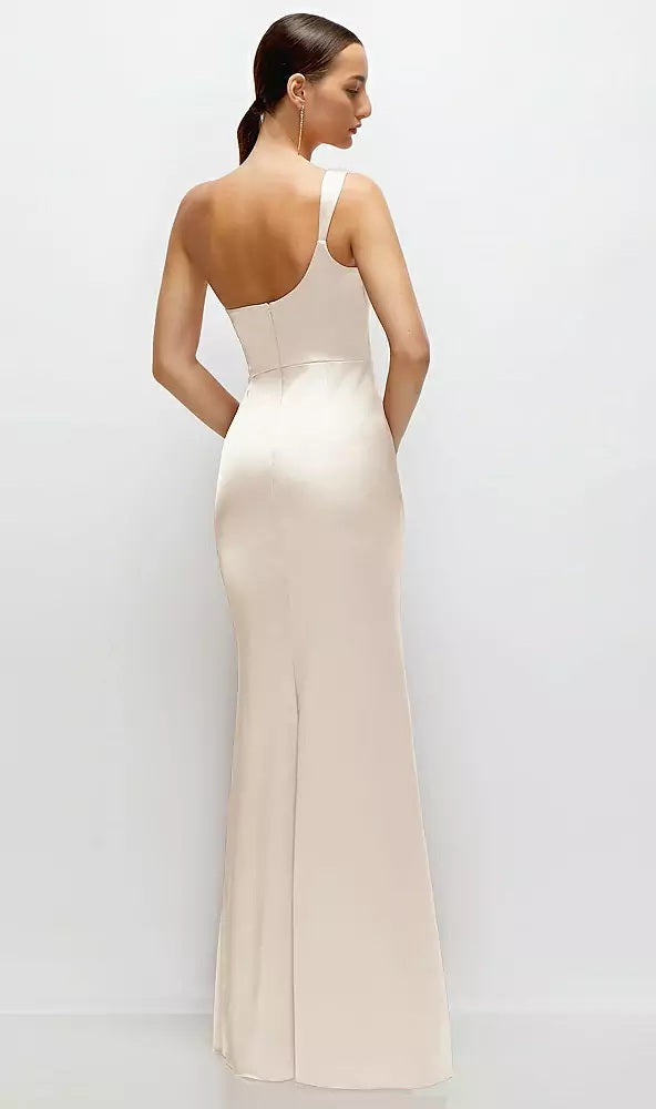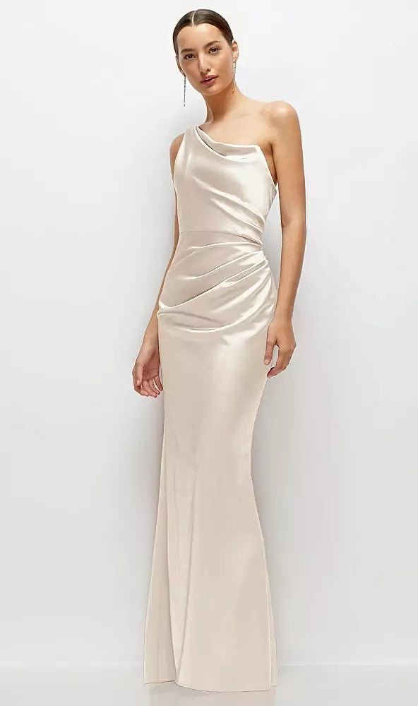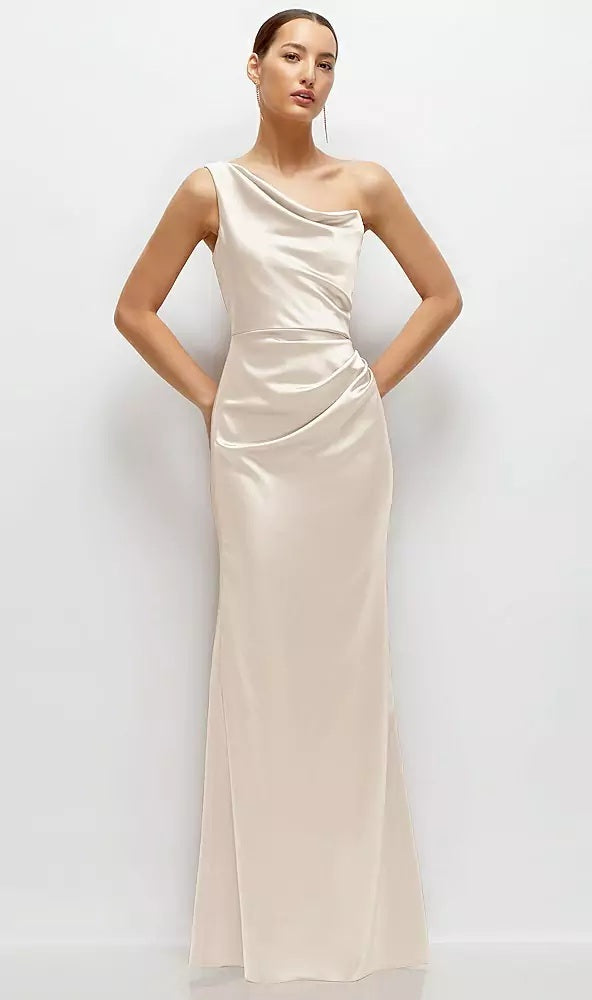 Channel modern goddess energy in the Nisha Bridesmaid Dress. Crafted from sleek neu stretch charmeuse, this fit-and-flare satin maxi stuns with its asymmetrical, one-shoulder neckline and softly draped cat-eye cowl detail. The pleated bodice contours beautifully, while subtle gathering at the hip adds shape and flow. The result? A silhouette that feels timeless yet totally now—made to move with elegance and turn heads every step of the way.