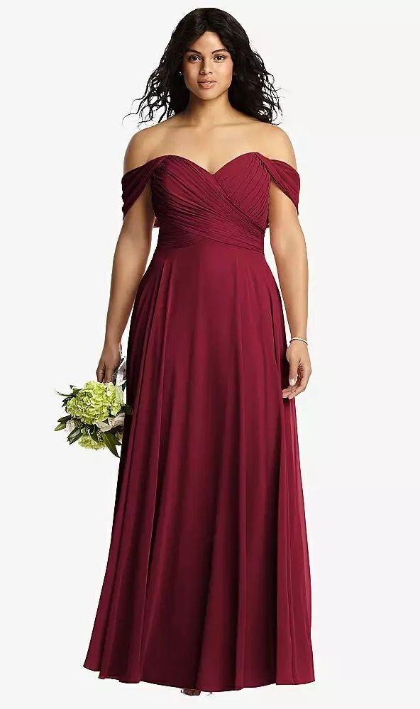 Designed to captivate, this lux chiffon bridesmaid dress features a romantic off-the-shoulder bodice with softly draped crossover styling. The full-length modified circle skirt flows effortlessly, offering elegant movement and a flattering silhouette. Perfect for bridal parties seeking timeless beauty with graceful ease.