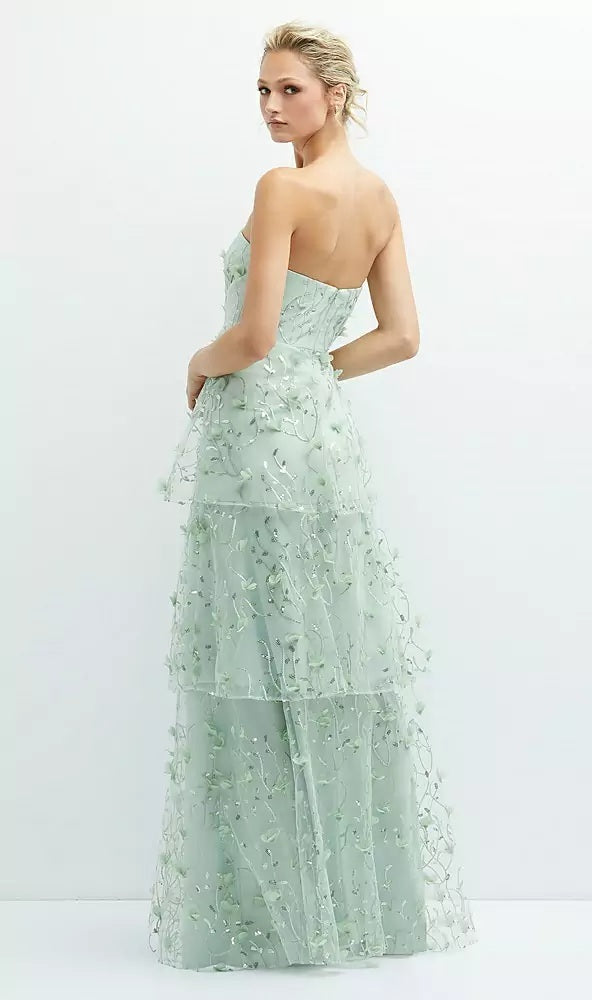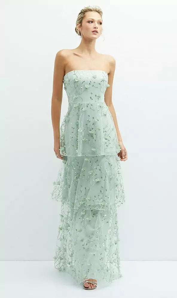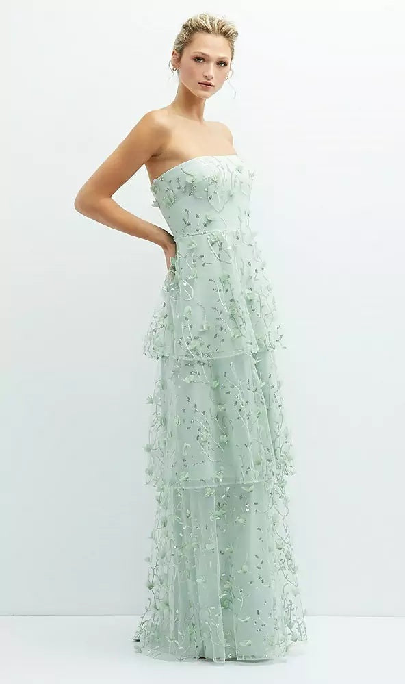 Step into a dream with the Pearl bridesmaid dress—an enchanting strapless gown crafted from Trellis 3D floral embroidered fabric with soft sequin accents that shimmer delicately with every movement. The fitted bodice flows into a tiered maxi skirt that adds volume, texture, and a fairytale-like charm. Whimsical yet elegant, this dress is made for twirling on the dance floor or adding a statement to any garden or spring celebration.