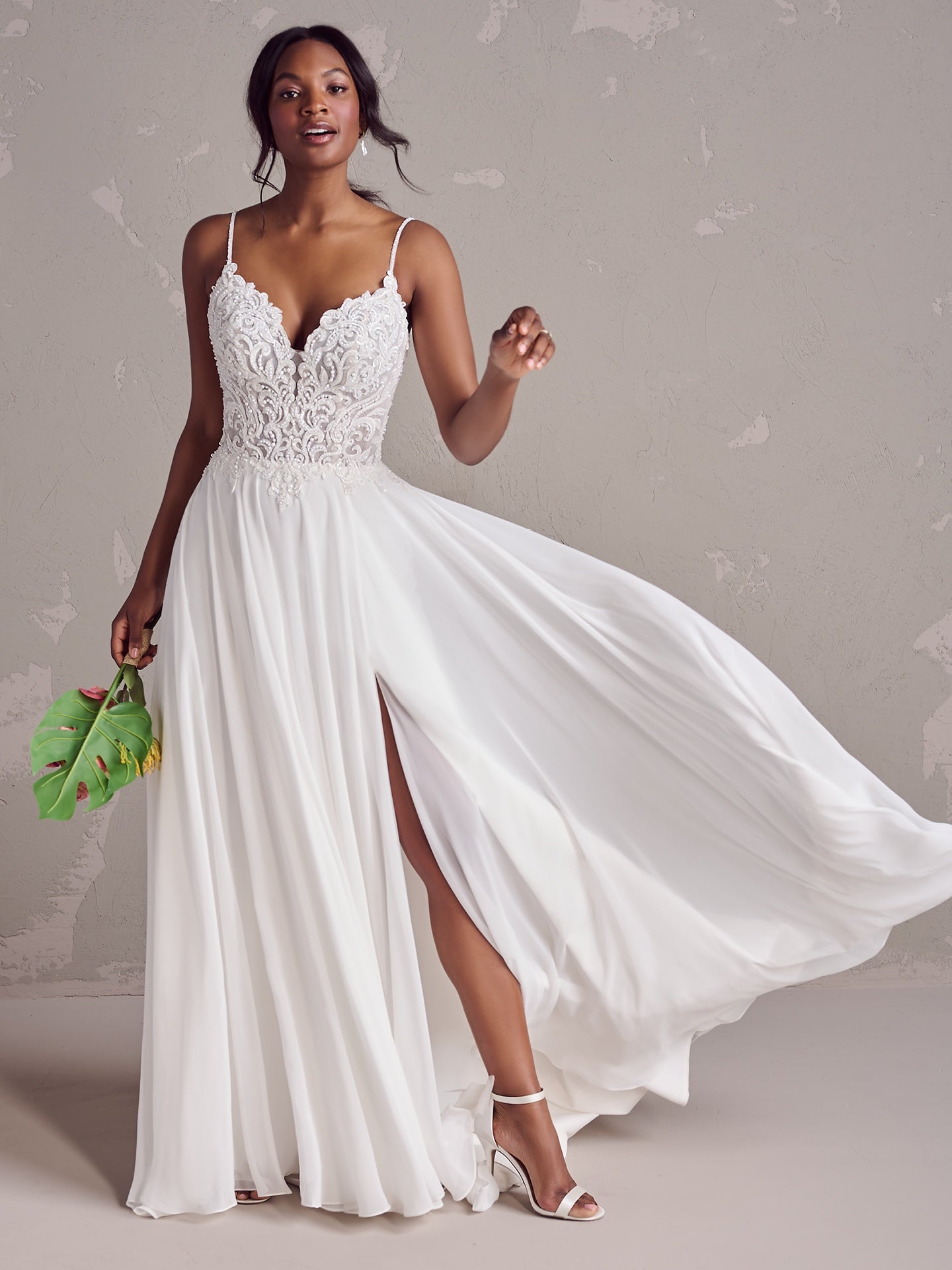 Check out this beautiful A-Line Plus Size Chiffon Wedding Dress! It has a gorgeous slit up the thigh and a lovely lace top that looks like it floats on your skin. It's an excellent choice for your second "I said yes" moment, and it's sure to make you shine on your big day!